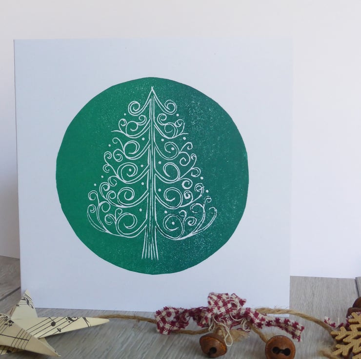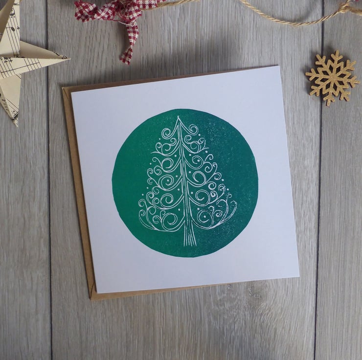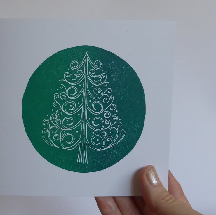 A graduated green Christmas tree Christmas card, handprinted from an original linocut on 300gsm card stock. The card has Happy Christmas handprinted in black inside with plenty of space to add your own greetings for friends and family.