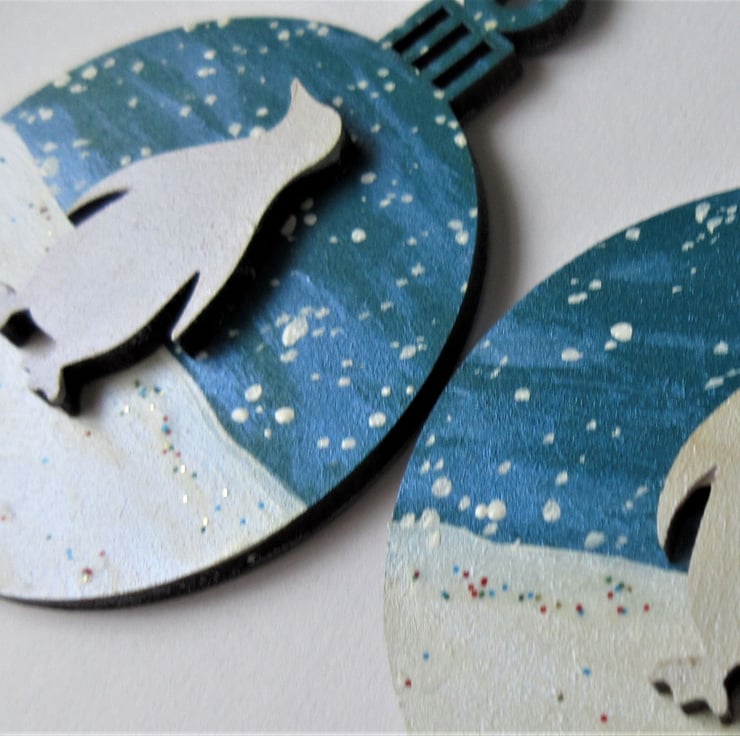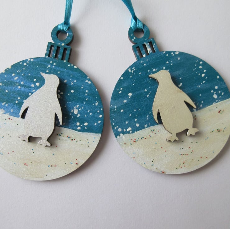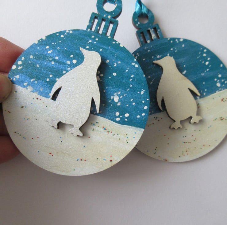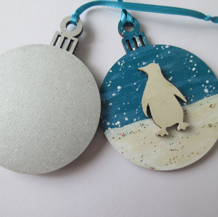 This is a 2D wooden bauble shape, hand painted with a winter background of a snow scene, and embellished with a little wooden penguin shape, painted white.