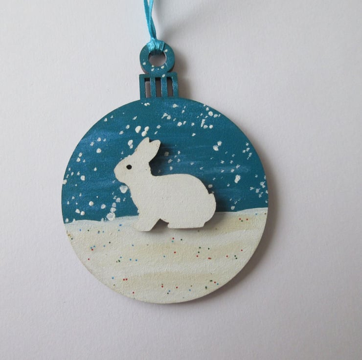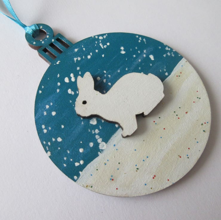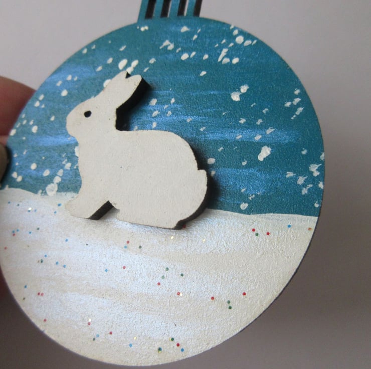 This is a 2D wooden bauble shape, hand painted with a winter background of a snow scene, and embellished with a little wooden bunny shape, painted white.