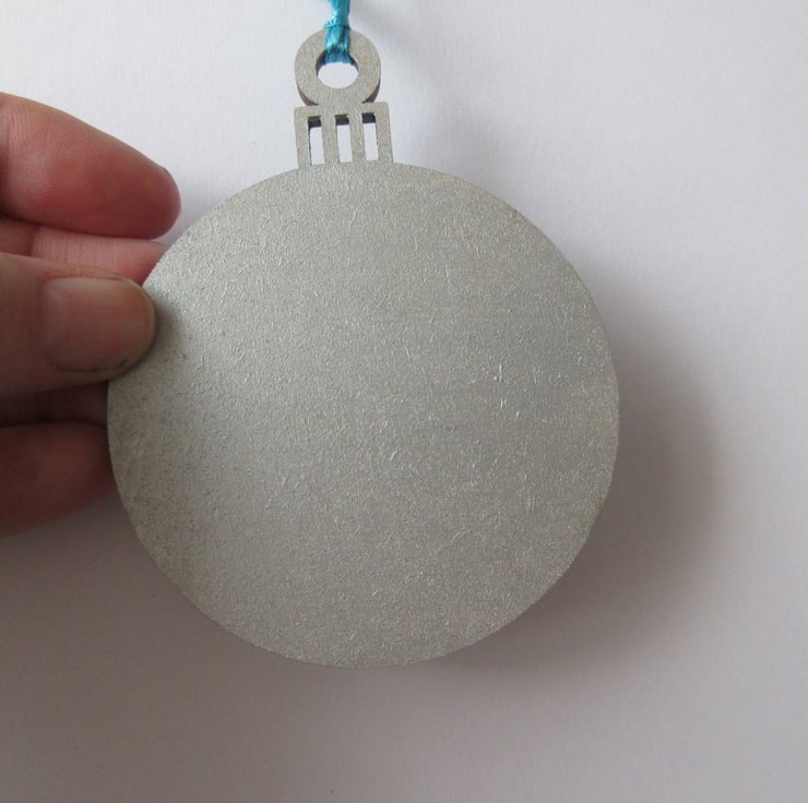 The bauble is 7cms diameter, and has a ribbon for hanging it by,