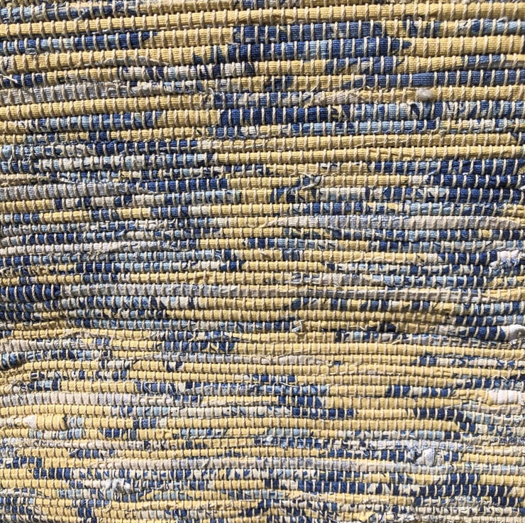 The Yellow & Blue Linen Rag Rug is handwoven on a cotton warp from a Linen upholstery textile. I really love how this fabric has been changed when it is woven.