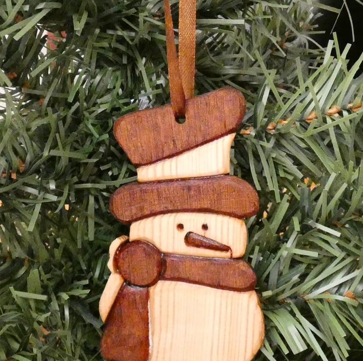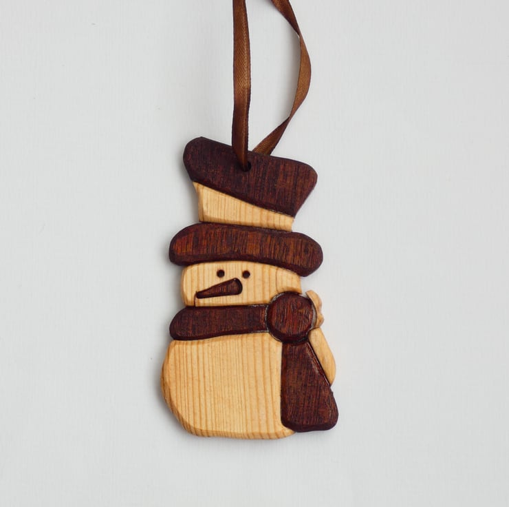 A piece of recycled wood was cleaned and sanded to enable me to upcycle it. The design was applied to the wood and cut using a Scroll Saw. The Intarsia woodworking technique was applied where different species of wood were cut and shaped into three dimensional pieces and then glued together to form a design. The snowman was coated in Danish Oil to protect the ornament. The Danish Oil is food and toy safe. To finish the decoration a ribbon was added to allow for hanging.