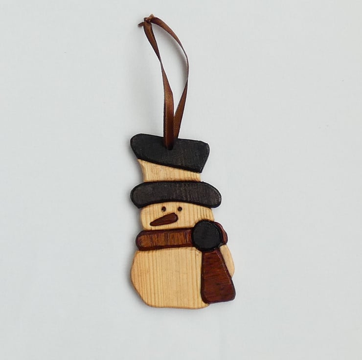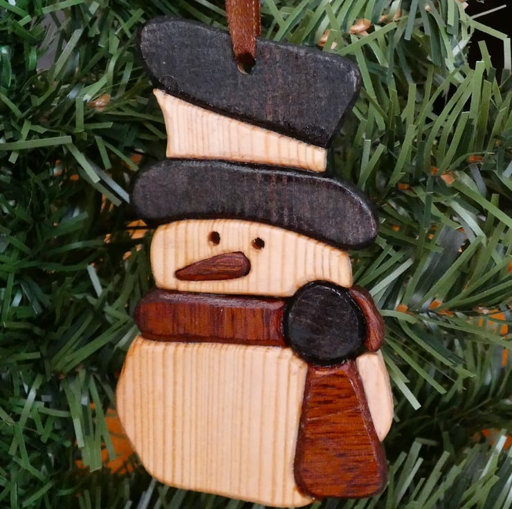 A piece of recycled wood was cleaned and sanded to enable me to upcycle it. The design was applied to the wood and cut using a Scroll Saw. The Intarsia woodworking technique was applied where different species of wood were cut and shaped into three dimensional pieces and then glued together to form a design. The hat was then woodstained. The snowman was coated in Danish Oil to protect the ornament. The Danish Oil is food and toy safe. To finish the decoration a ribbon was added to allow for hanging.