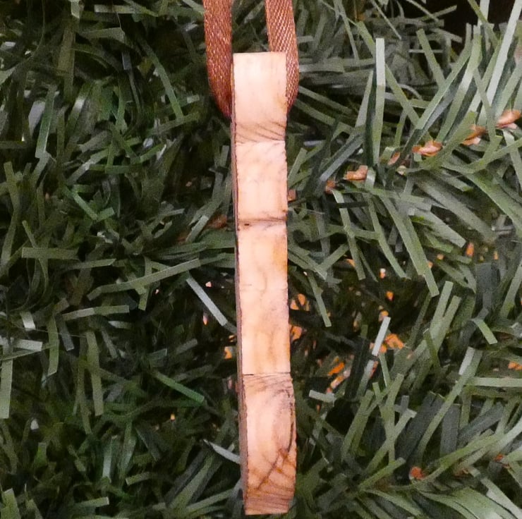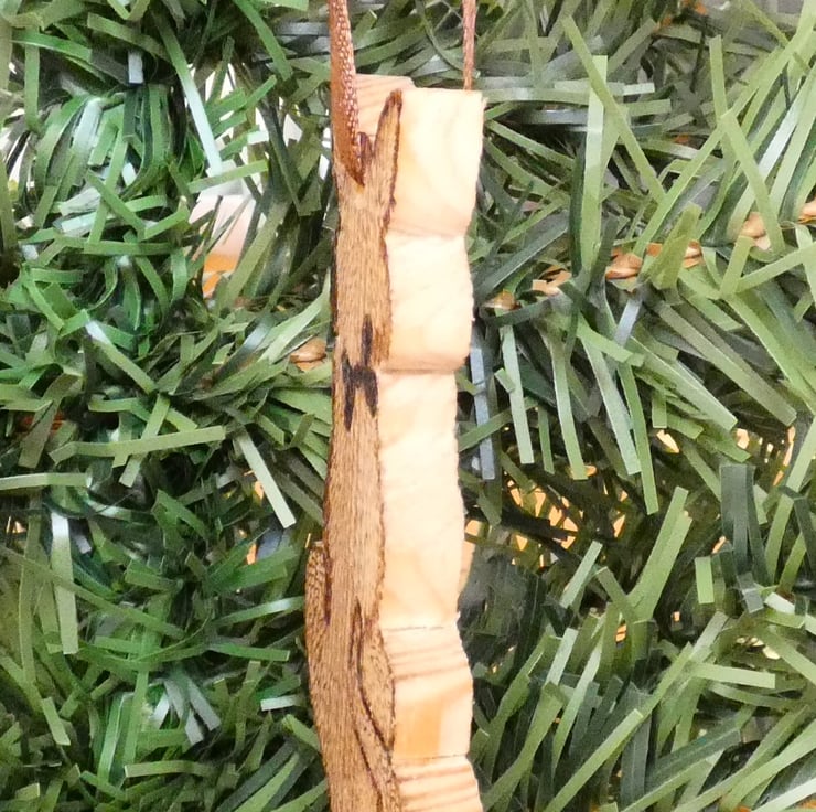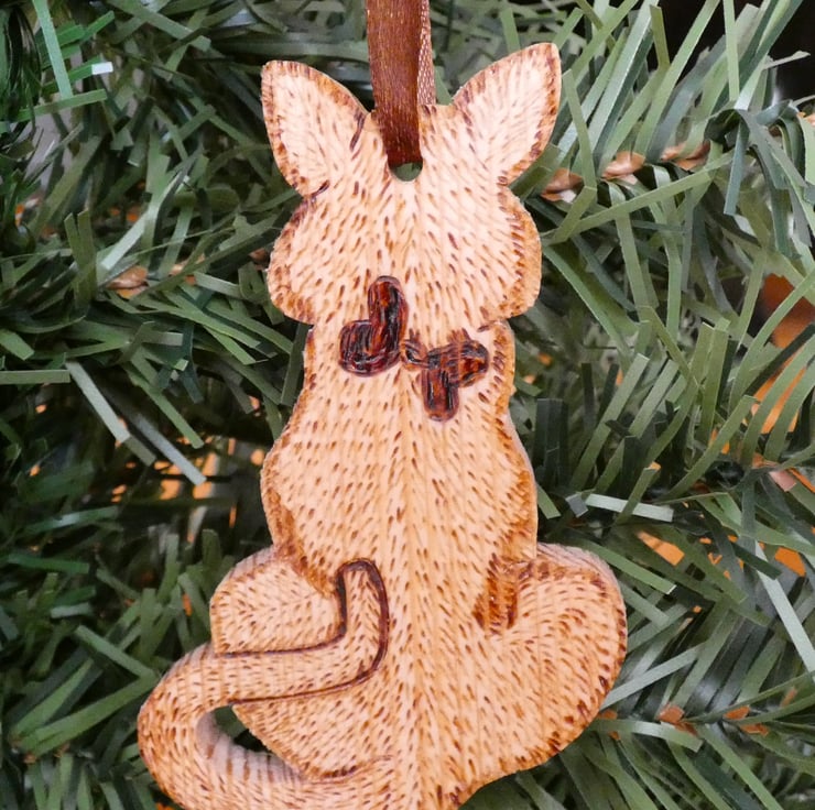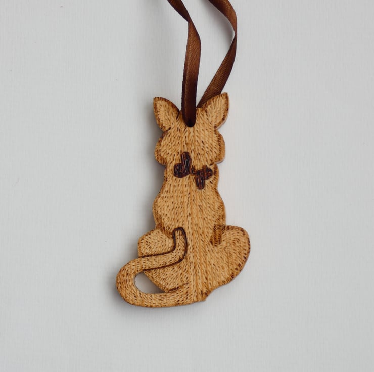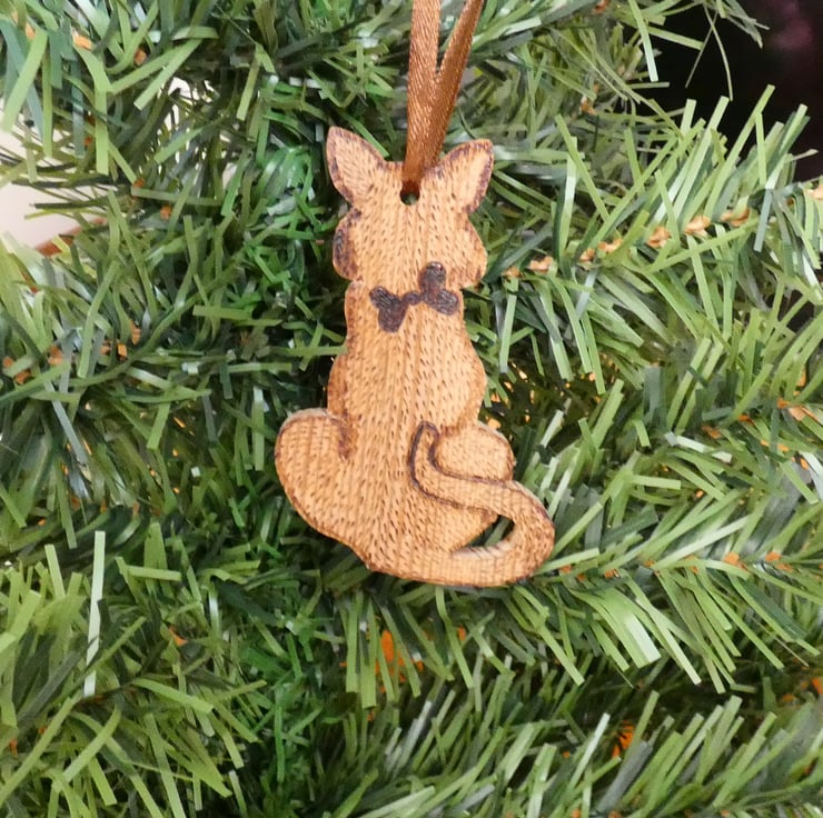 A piece of recycled wood was cleaned and sanded to enable me to upcycle it. The design was applied to the wood and cut using a Scroll Saw. The details of the cat were then wood burned onto the wood using the method of pyrography (also known as fire writing). The cat was coated in Danish Oil to protect the ornament. The Danish Oil is food and toy safe. To finish the decoration a ribbon was added to allow for hanging.