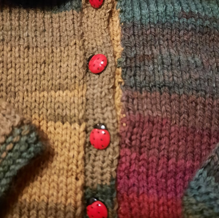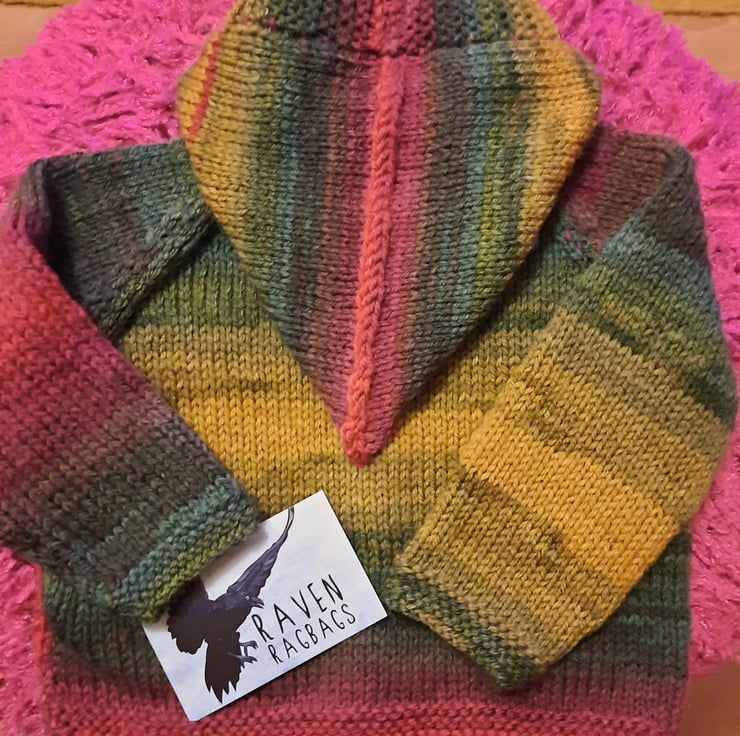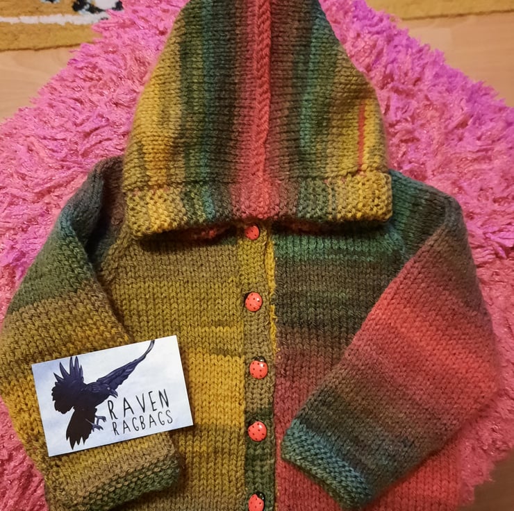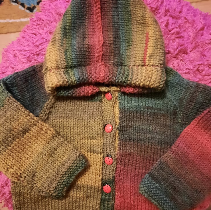 Beautiful warm Autumn colours make this a very special hoody for a baby appropriately 3 to 6 months with a chest measurement of 18 to 20 inches, back length 10 inches and sleeve length 7 inches. This soft acrylic and wool blend yarn washes at 30 degrees centigrade machine washable wool cycle. Fastening with 5 cute shiny red ladybird buttons and with a snugly hood this is the perfect choice to keep your baby warm and toasty.