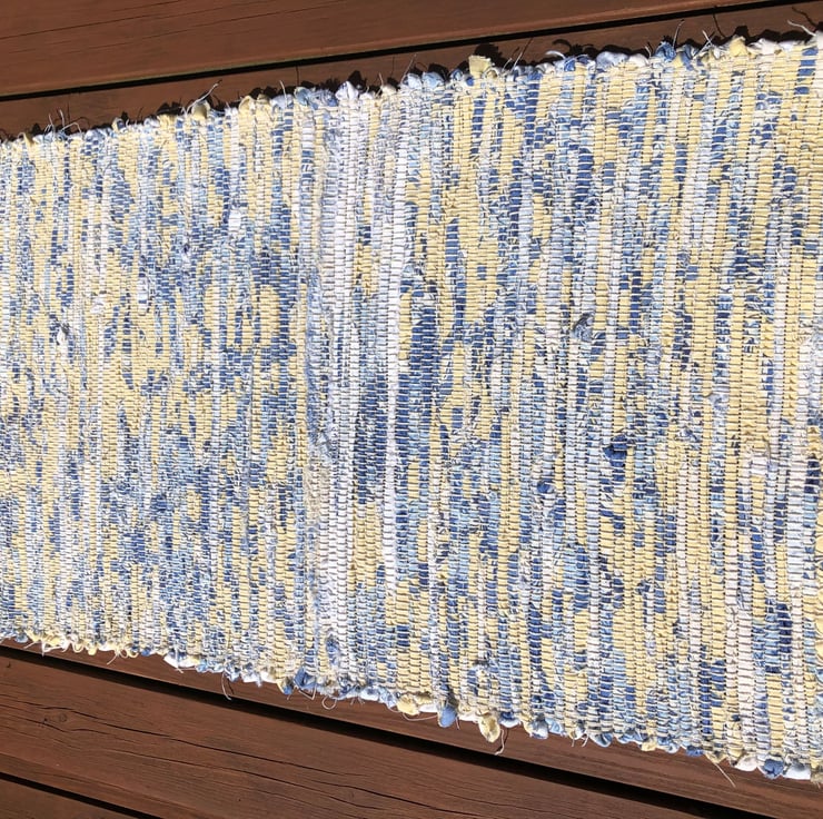 This Yellow and Blue fringed rag rug is handwoven from an upholstery weight floral linen and a natural cotton warp.