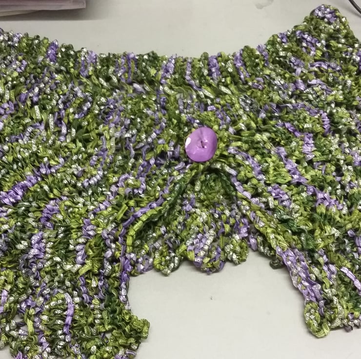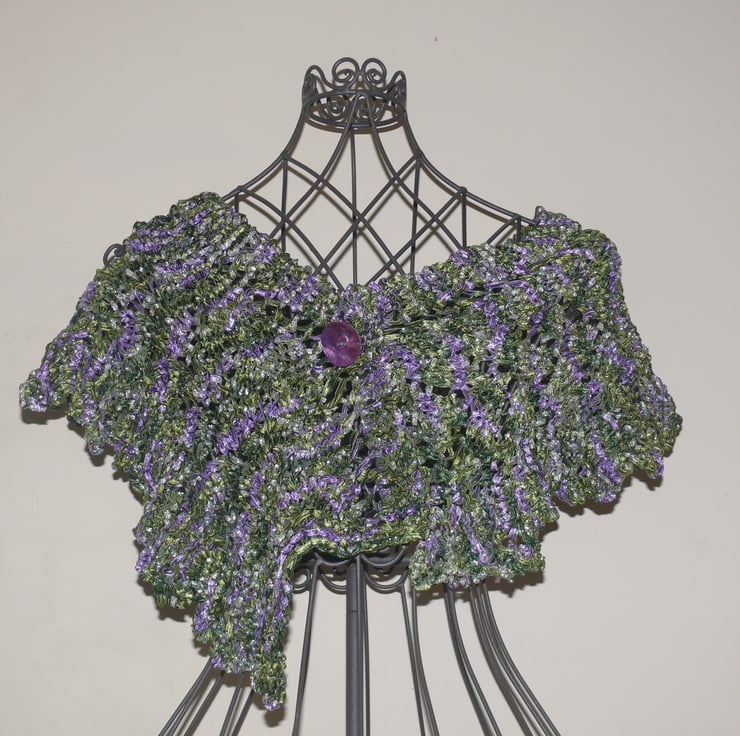 Hand knitted shawl in Louisa Harding Sari Ribbon Wool & finished with purlescent Mother of Pearl shell button.