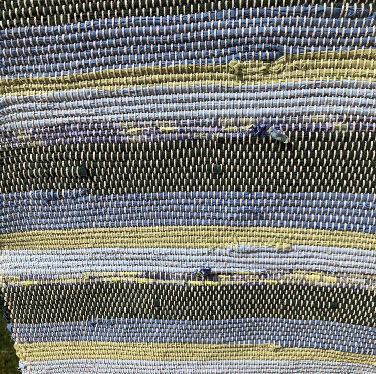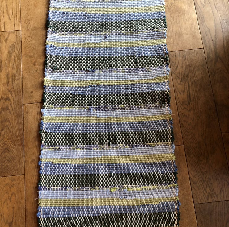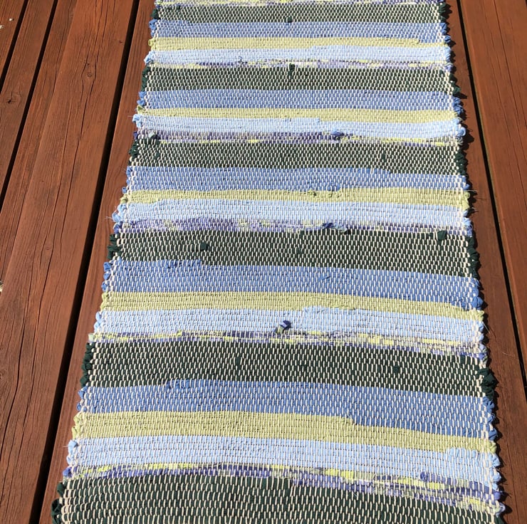 The Blue and Green is a beautiful stripped rag rug handwoven from upcycled cotton sheeting and a natural cotton warp. With dark and lime green strips mixed with pale blue and mid blue strips and a cream warp makes this an interesting rug.
