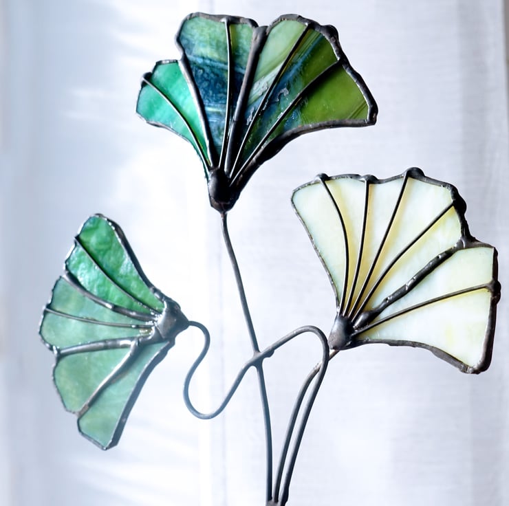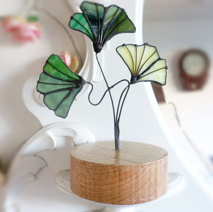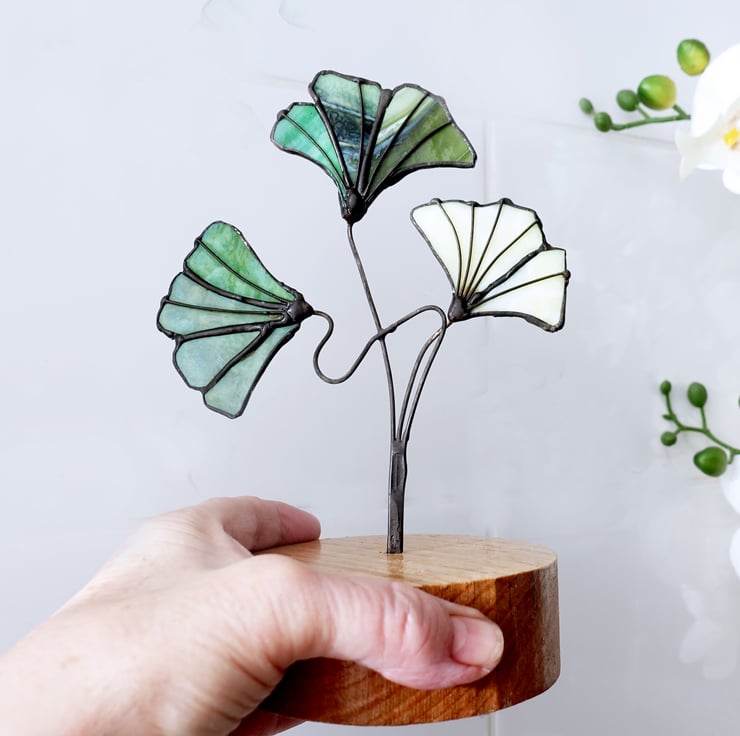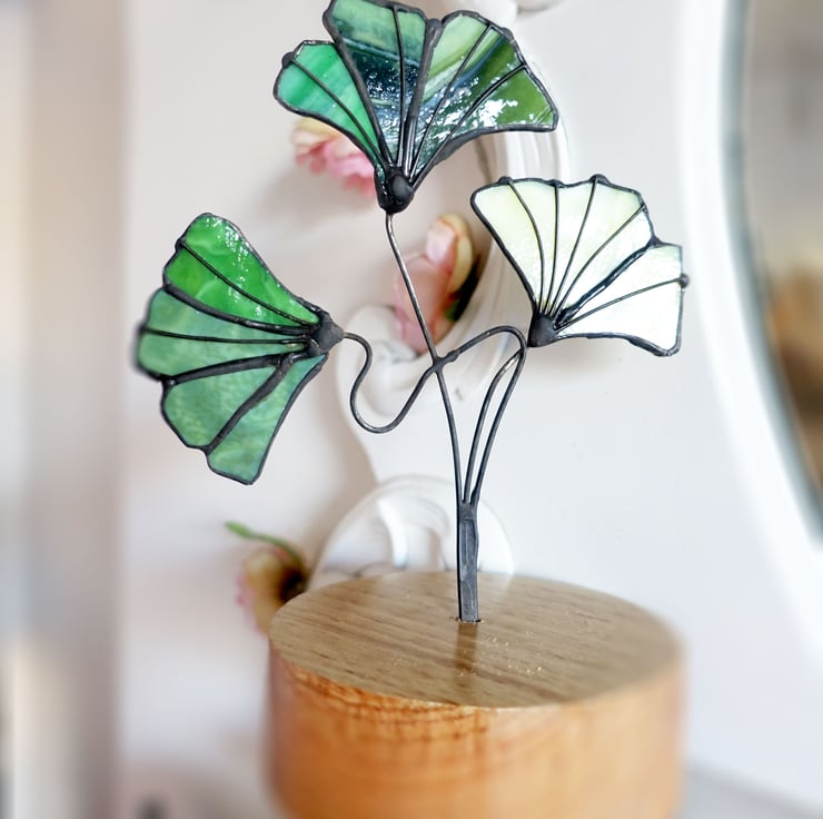 I have many pieces of rare, discontinued glass and this mix of green ring mottle has inspired the Art Deco design here of the Gingko plant.