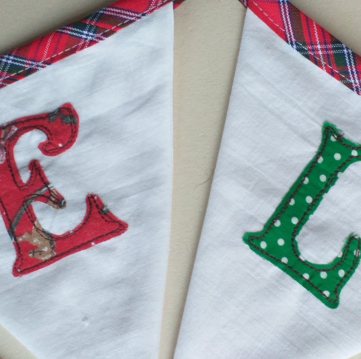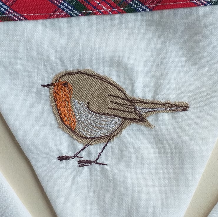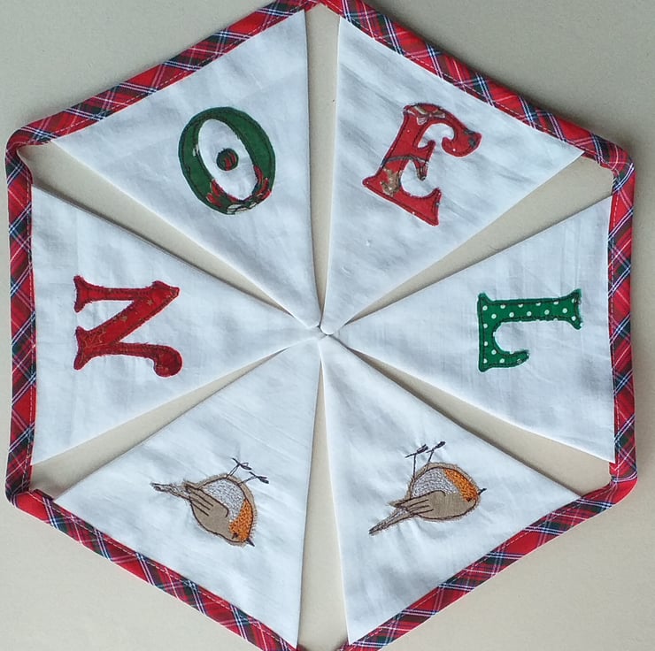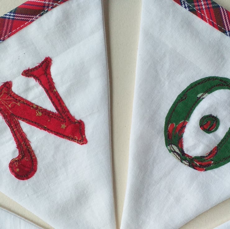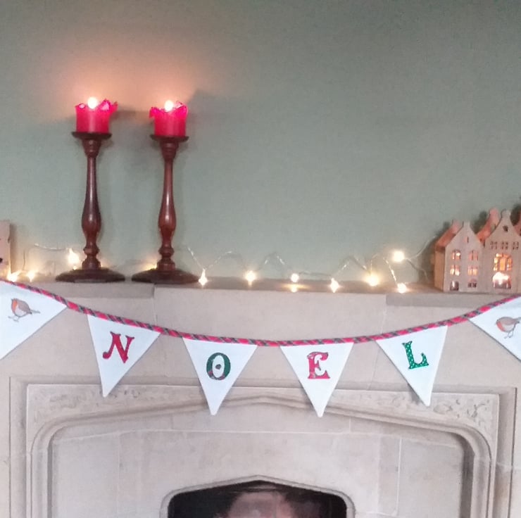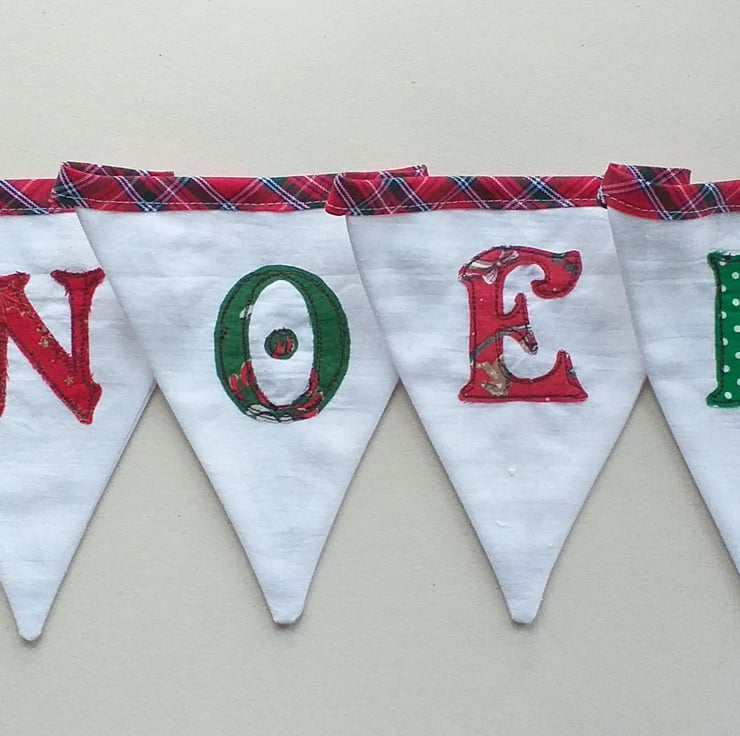 Festive Noel bunting. White cotton flags with the letters NOEL embroidered in fabrics of reds and greens, with a cheeky robin at either end sewn using freestyle machine embroidery, all bound together with a lovely green and red tartan tape.