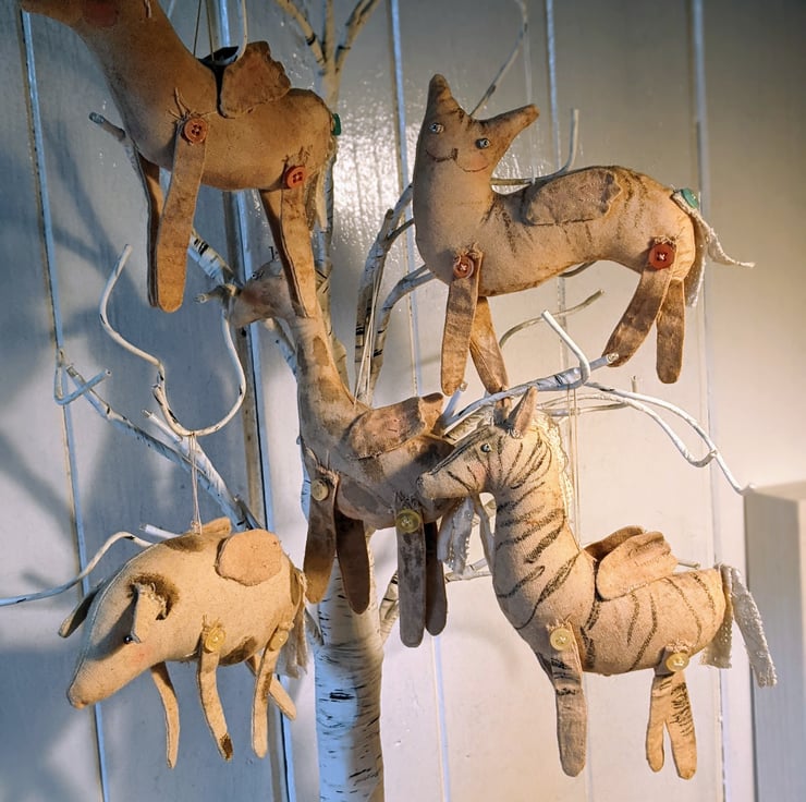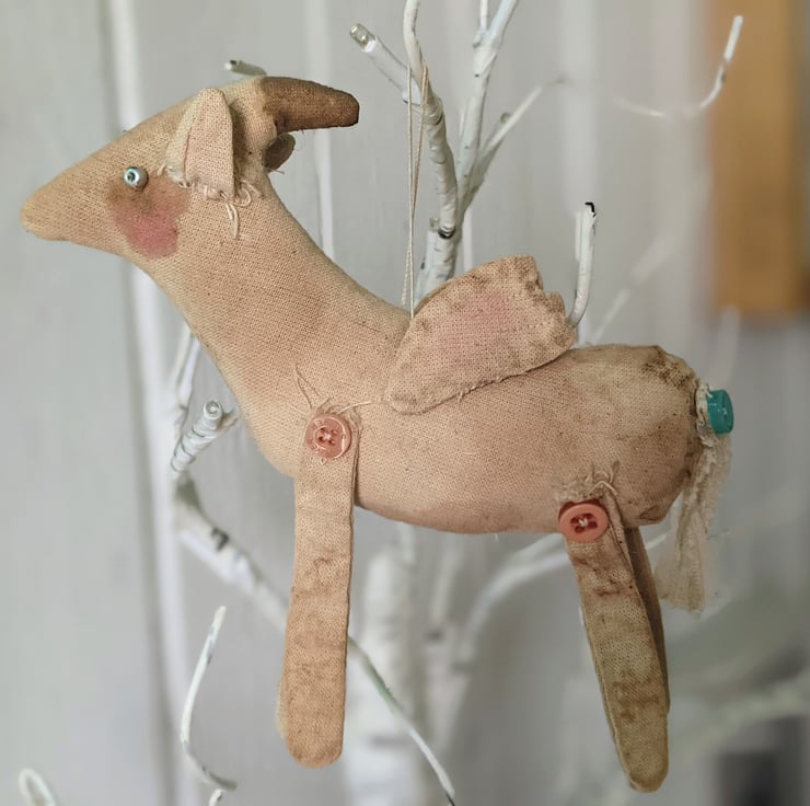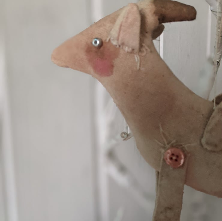 This little goat is machine and hand stitiched, hand stained and hand painted. With buttons on his flopsy legs, vintage lace for a tail also topped with a wee button.