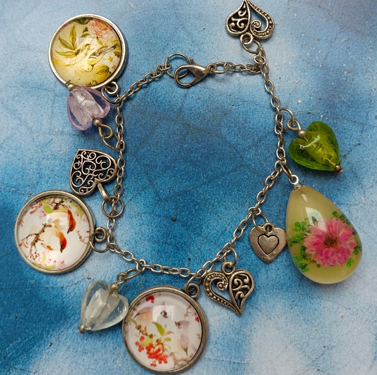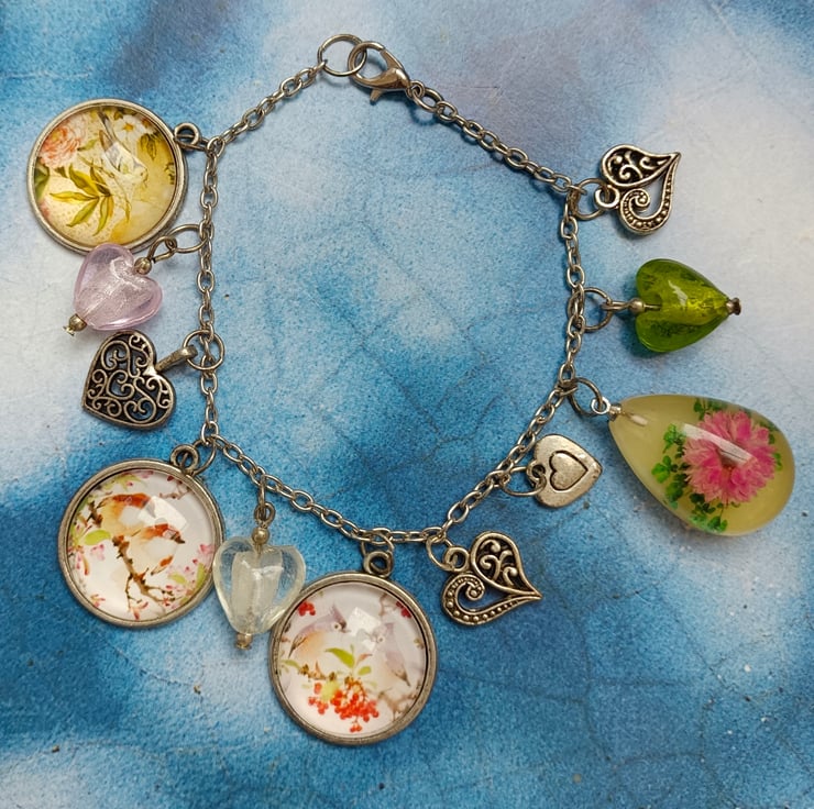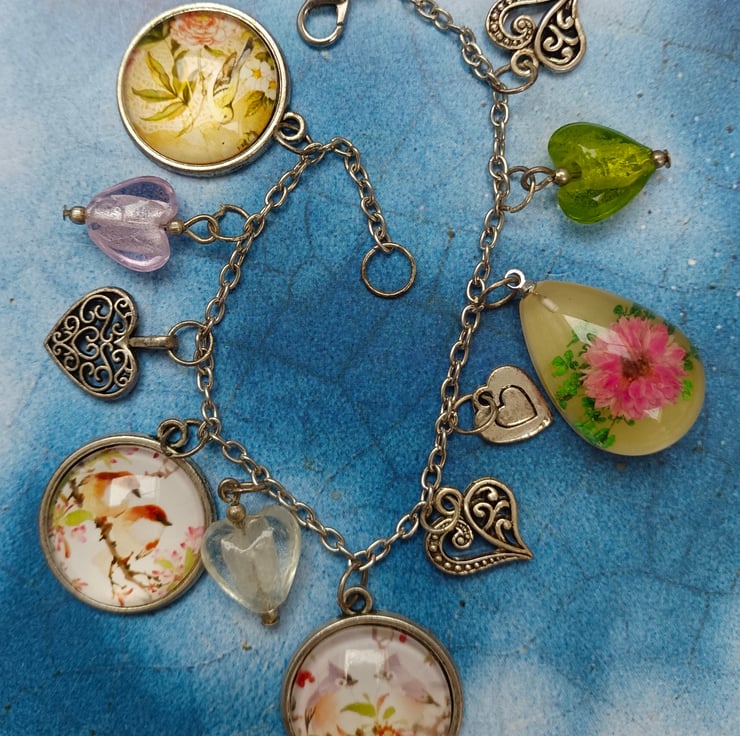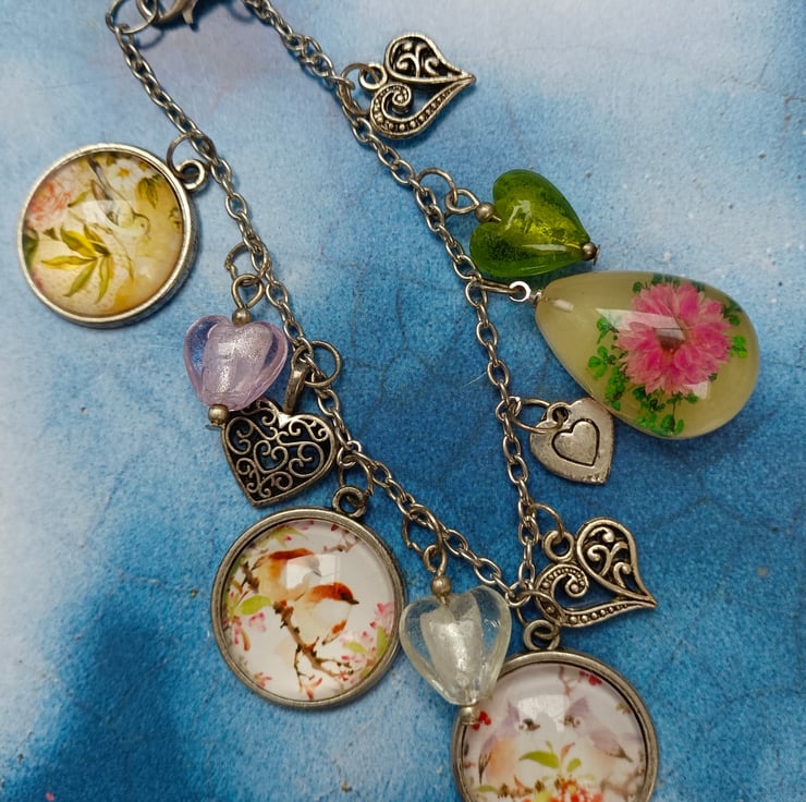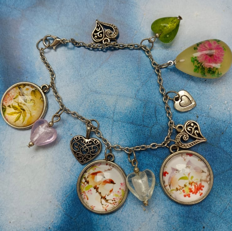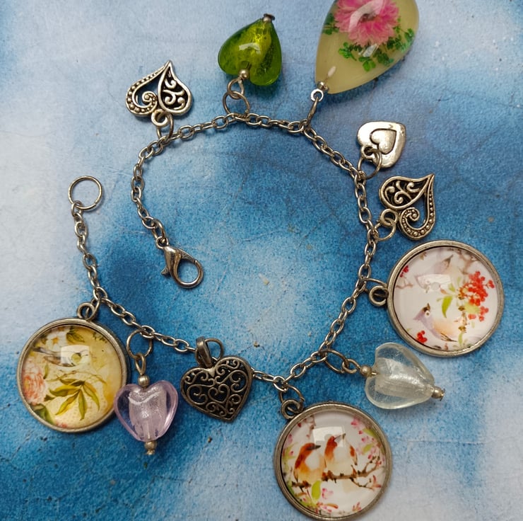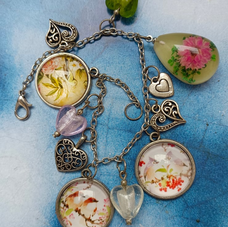 A gorgeous and unique handmade charm bracelet with a sterling silver chain with a lobster clasp fastener. Featuring a really pretty and eclectic combination of Tibetan silver heart charms, little glass hearts, an acrylic flower tear drop shaped stone and beautiful glass cabochons with a selection of delicate birds and flowers.