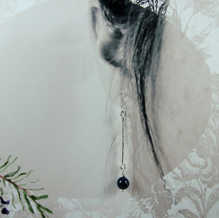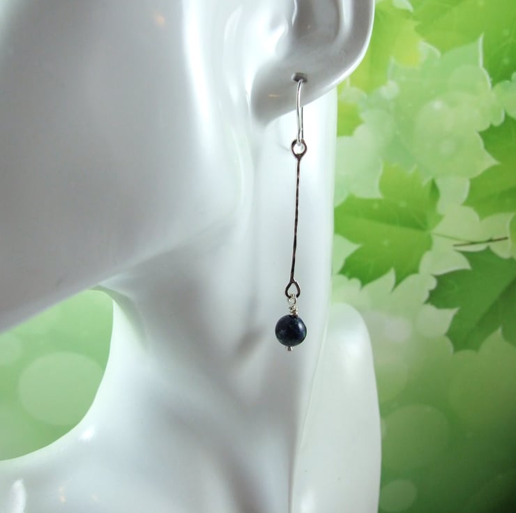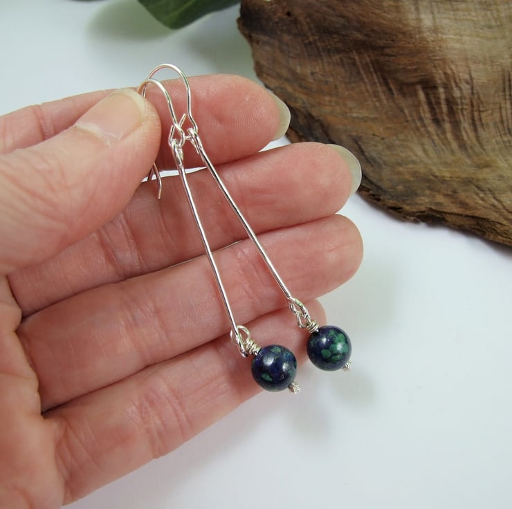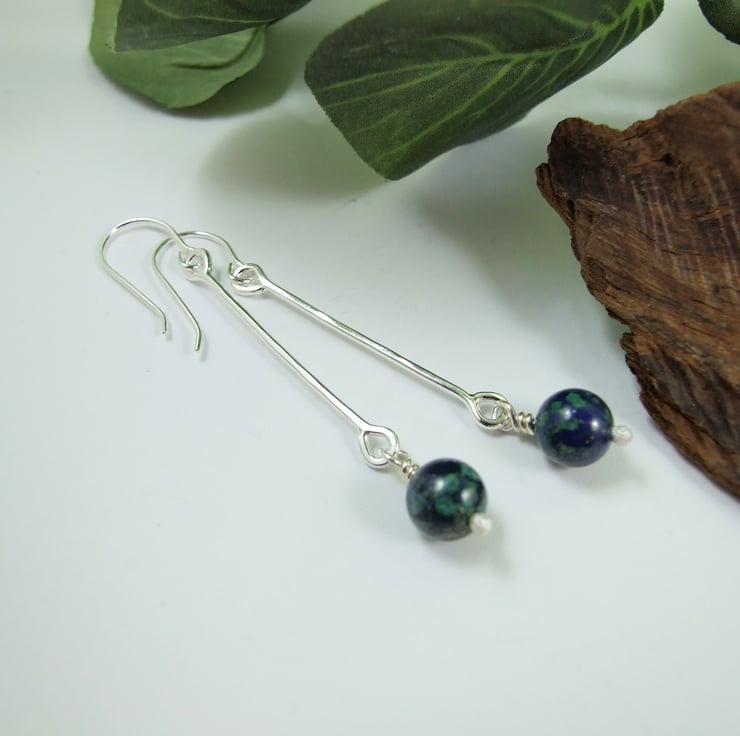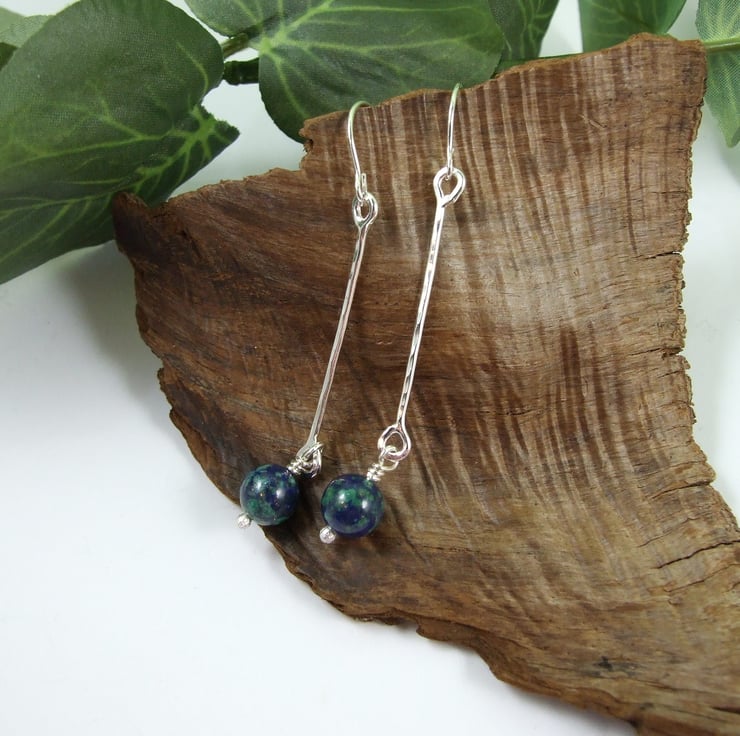 I have created the stick or fine bar shape using 1.2mm thick sterling silver wire. I created a loop at each end and soldered closed then textured with a hammer. Attached to the bottom are 8mm chroysocolla gemstone beads securely wrapped to the stick with my own handmade silver pins. Fitted to my own handcrafted sterling silver earwires.