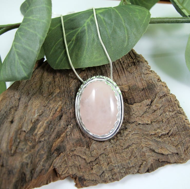 I have designed the bezel to fit the rose quartz gemstone perfectly. Handcrafted from sterling silver sheet and edged with 2mm thick solid silver wire which is have notched at the top to add texture and interest.