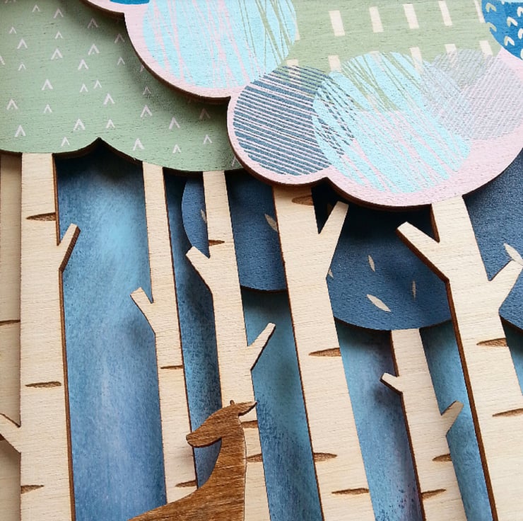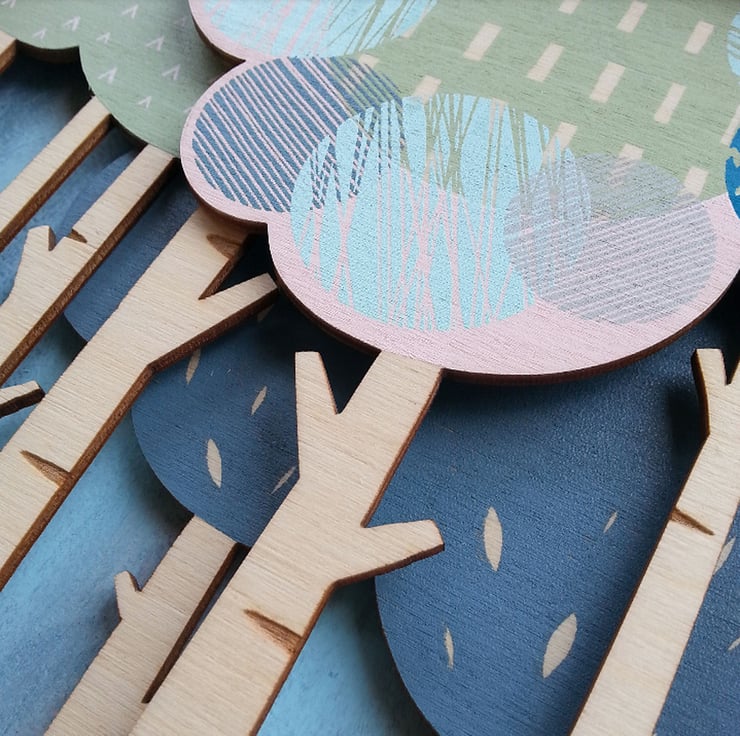 The design comes from original drawings which have been transformed into layers of laser cut wood, which I have then screenprinted in pinks, blues, greens and greys, and built up to form 3d layers set into a glazed stained wooden box frame. The frame measures 24cm x 24cm, and the scene itself measures 20cm x 20cm.