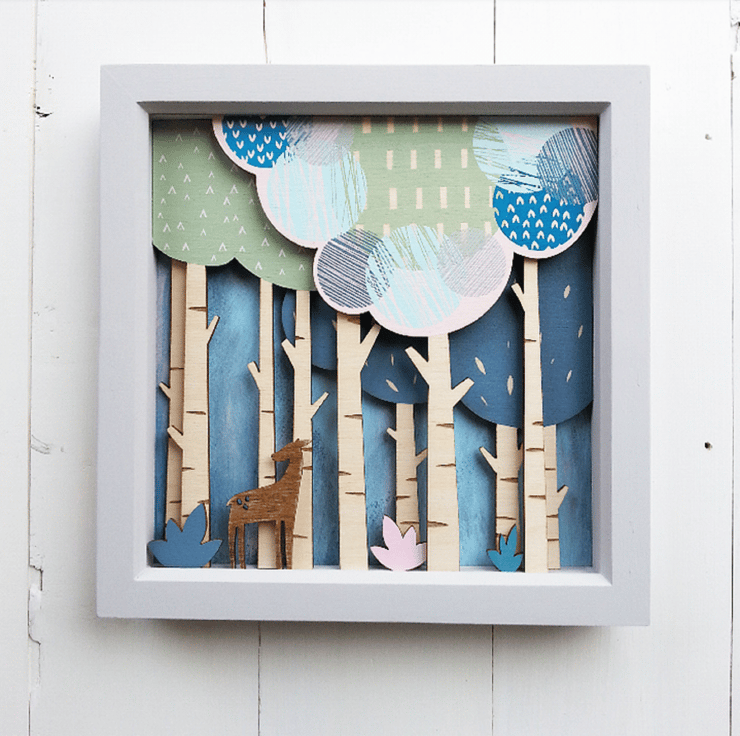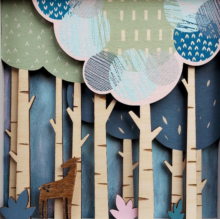 This one of a kind wooden diorama picture features a deer wandering through a forest. The surface pattern is created using mostly screenprinting with some handpainting to create a completely unique look. It is inspired by my love of nature and wildlife, and my fascination with stage sets and the creation alternative little worlds.