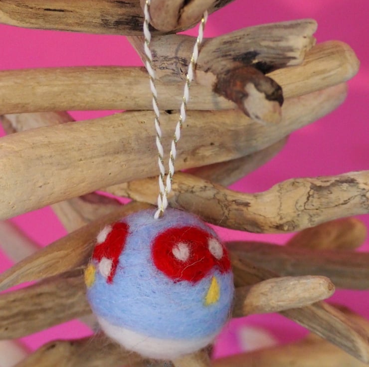 Measuring approximately 4cm (plus 7cm of hanging twine) this handfelted bauble is made by myself by attaching wool felt to a lightweight ball.