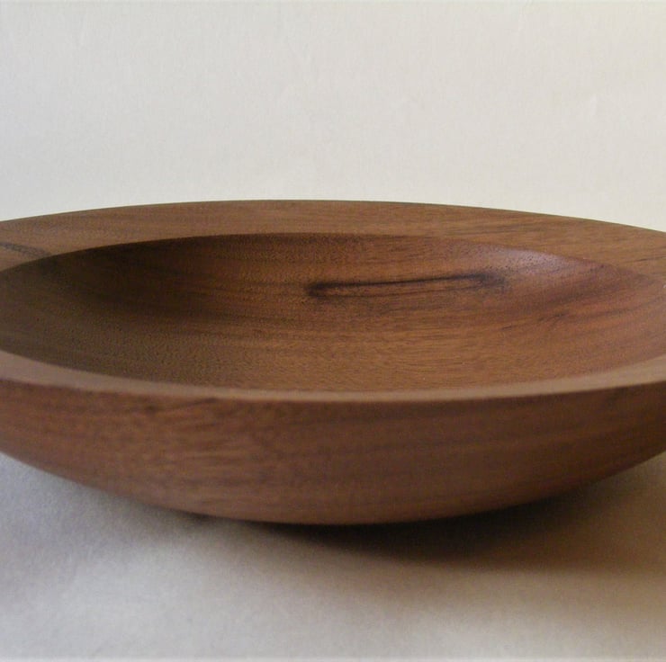 Walnut bowl, 190 x 42mm, Finished in Danish oil. A wide rimmed Walnut bowl, the rim slopes slightly inwards, with the inside and outside curving gently. The shape shows off the lovely chocolate colour and streaks of the Walnut. It would make a lovely decoration or practical bowl.