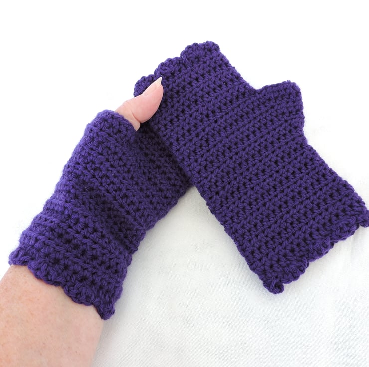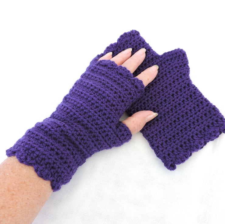 I've crocheted these fingerless mittens using a 100% premium acrylic yarn. A beautiful rich purple colour. They have a plain body with a wavy edge top and bottom. Perfect winter warmers. Measurement from bottom to top is 7.5ins (19cm), with a circumference of 7ins (18cm).