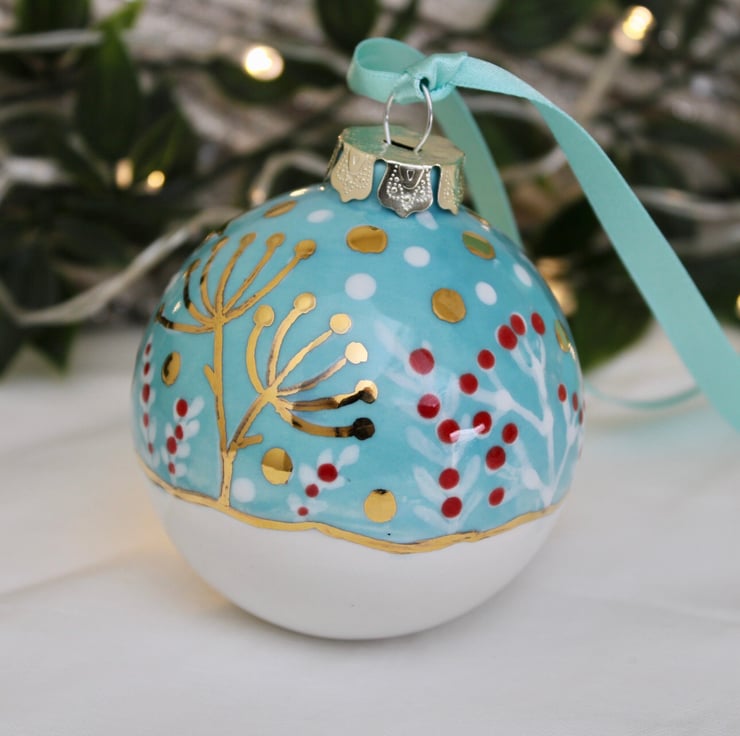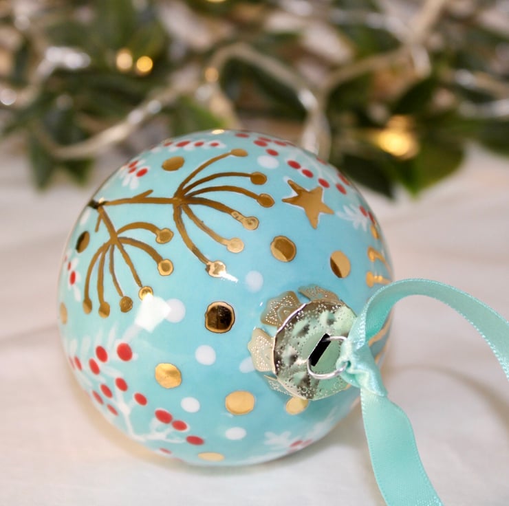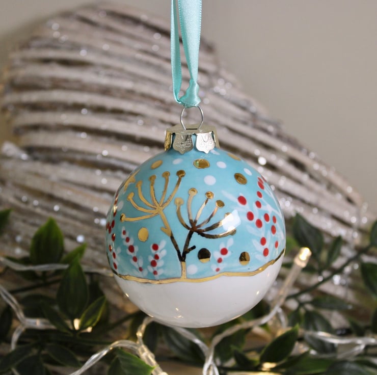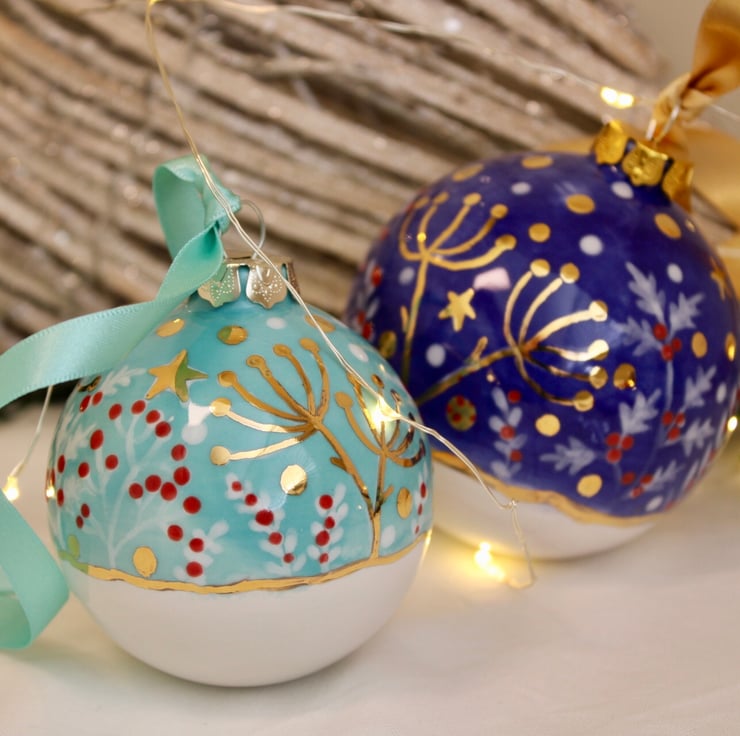 This is my winter wildflower ceramic bauble. I paint an array of berries and wildflowers in lovely vibrant glaze on to the bauble before being kiln fired. Then the magic is applied as I paint the wonderful gold lustre stars and snow and fire for a second time. Ensuring a bright twinkling keepsake. All baubles are hand painted by myself making all truly unique.