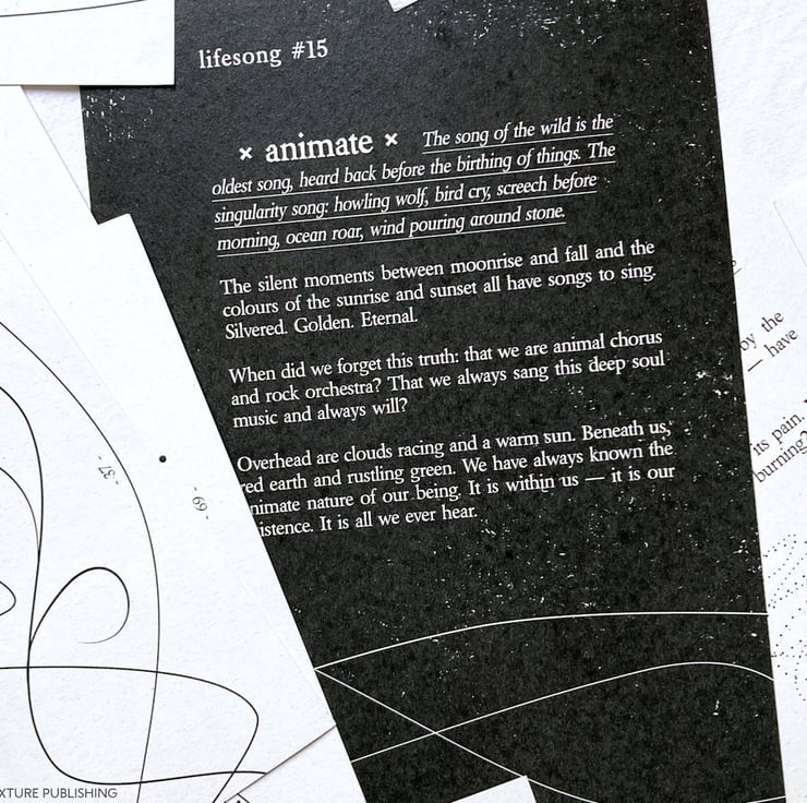 Open yourself to the song running through you: it echoes the world and the quiet rhythms of your body. Song crosses the universe: every particle, a note. Song, deep in the soul, emerging in the hum of a child lost in play, a terrible roar or long note of sadness. Lifesongs, by poet Steve Thorp and illustrator Ruth Thorp, explores a deeply soulful phenomenon: our relationship to Earth and our experience of self.