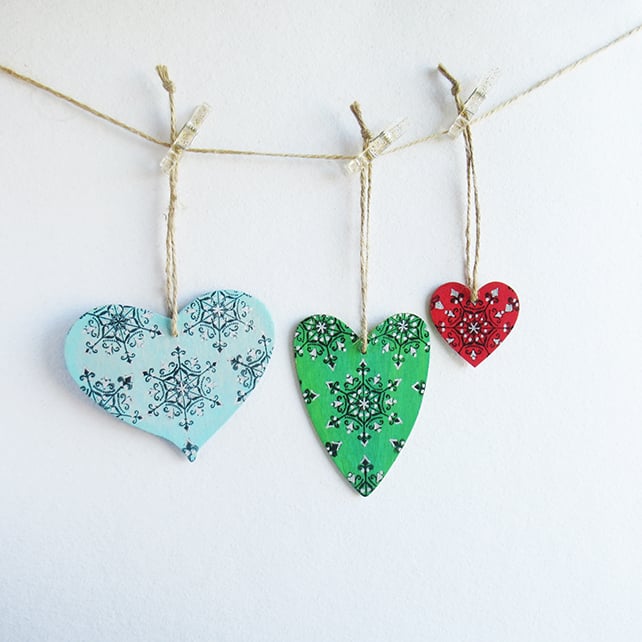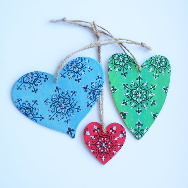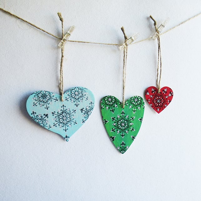 There is a mini red heart, a long heart painted in green on one side and the reverse painted in a lime green colour and the final wide heart is painted in a pale blue colour on one side and its opposite side in a pale turquoise blue colour.