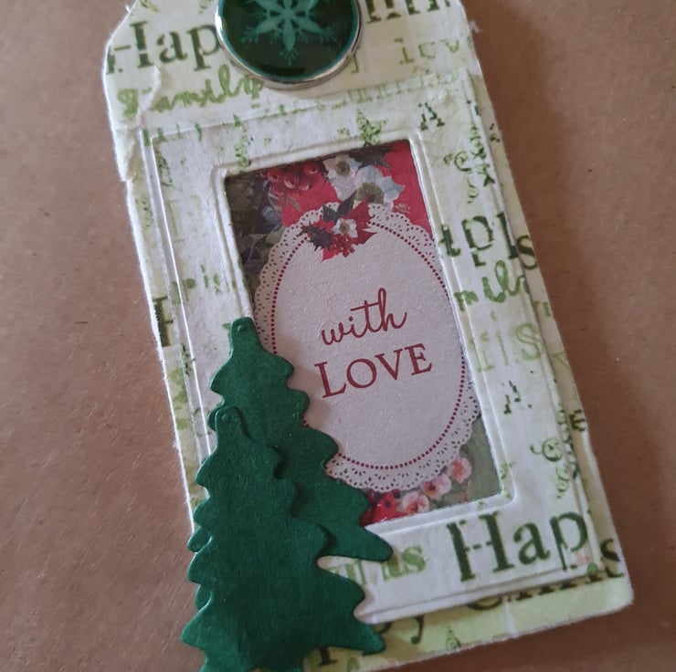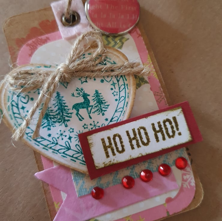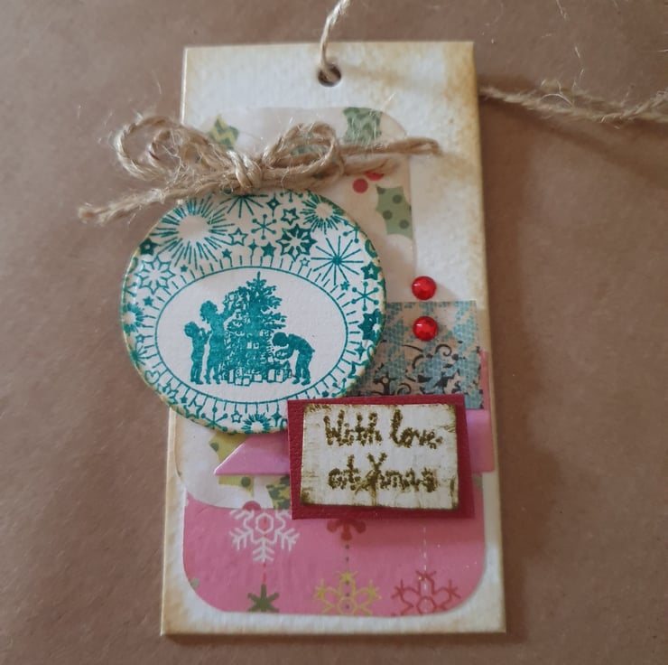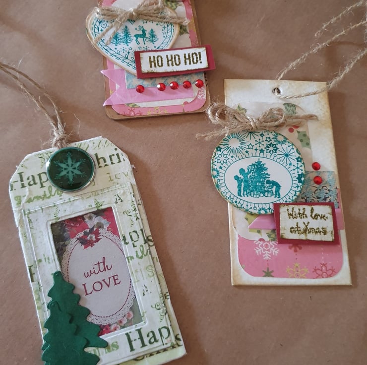 These 3 tags are upcycled from clothing tags, thick card tags, covered and embellished in Christmassy themes