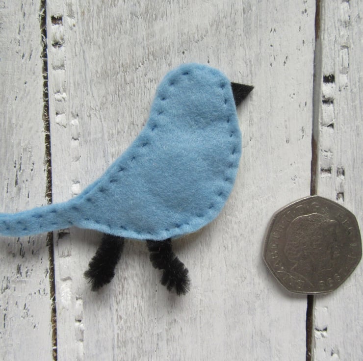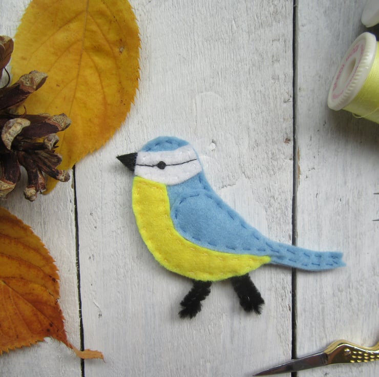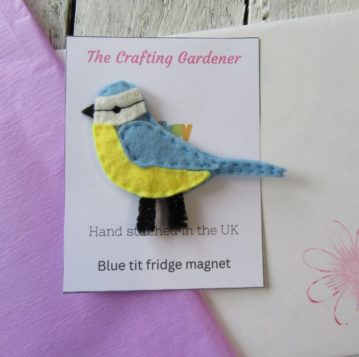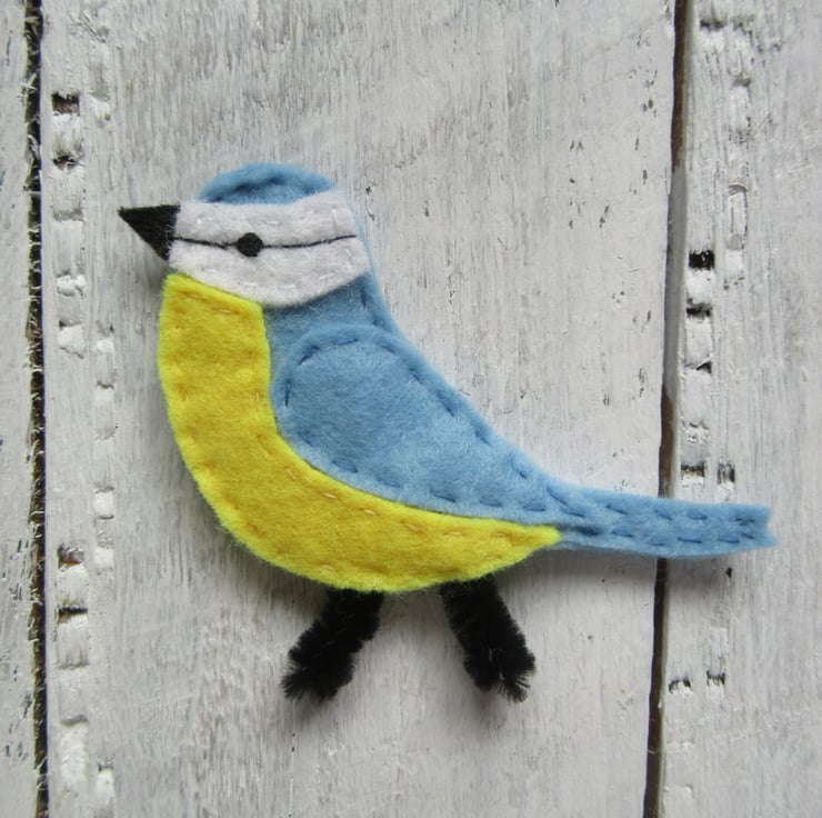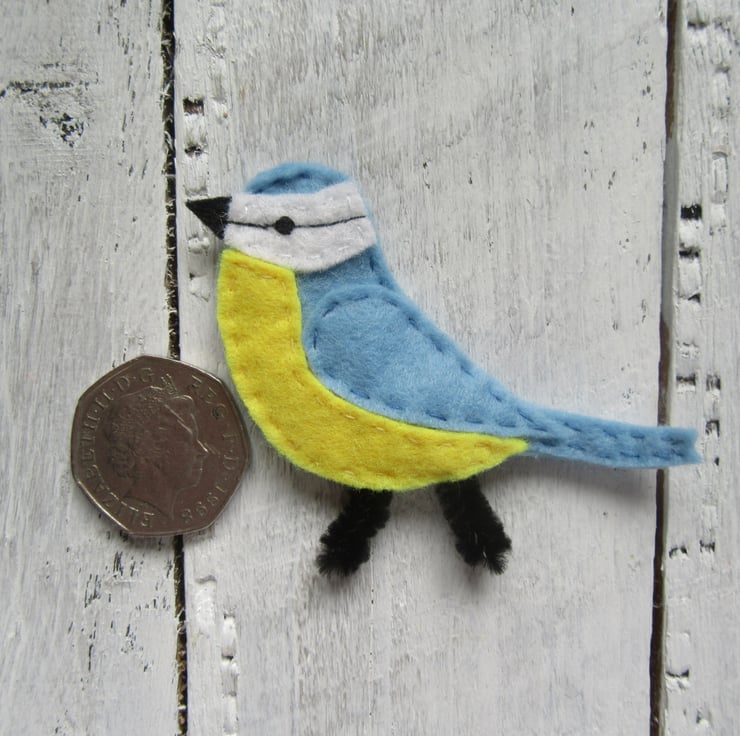 Hand stitched felt blue tit fridge magnet. With chenille pipe cleaner legs