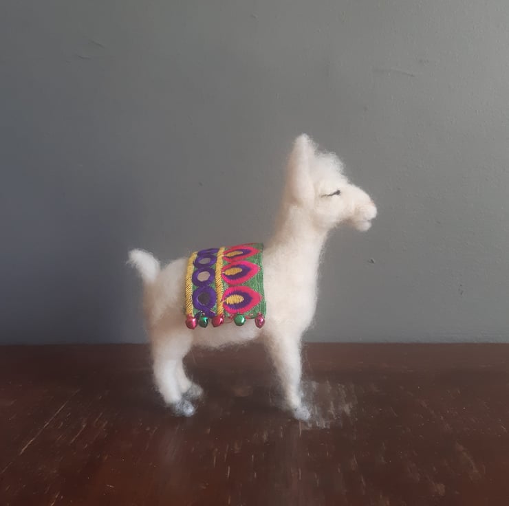 The wool is wrapped and sculpted around a wire armature. This lovely llama is wearing a colourful, sparkly blanket and I have stitched little bells to the edges. It is soft and fluffy with its merino wool coat, characteristic banana llama ears and has a sleepy, peaceful expression! A great little character to have around the house. If you would like me to attach a loop so it can be hung up - please message me.
