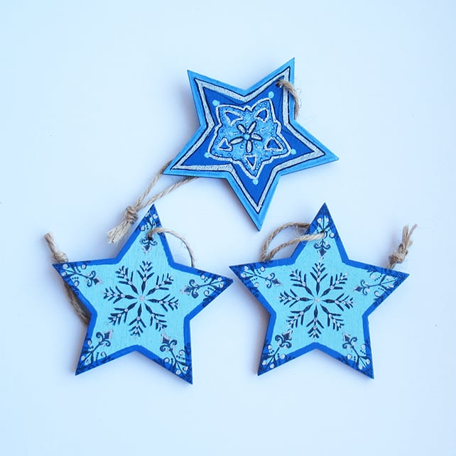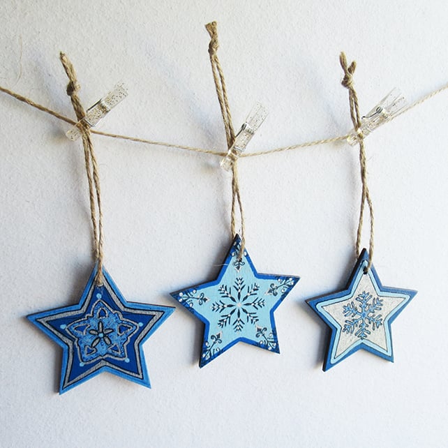 Set of three festive wooden star decorations.