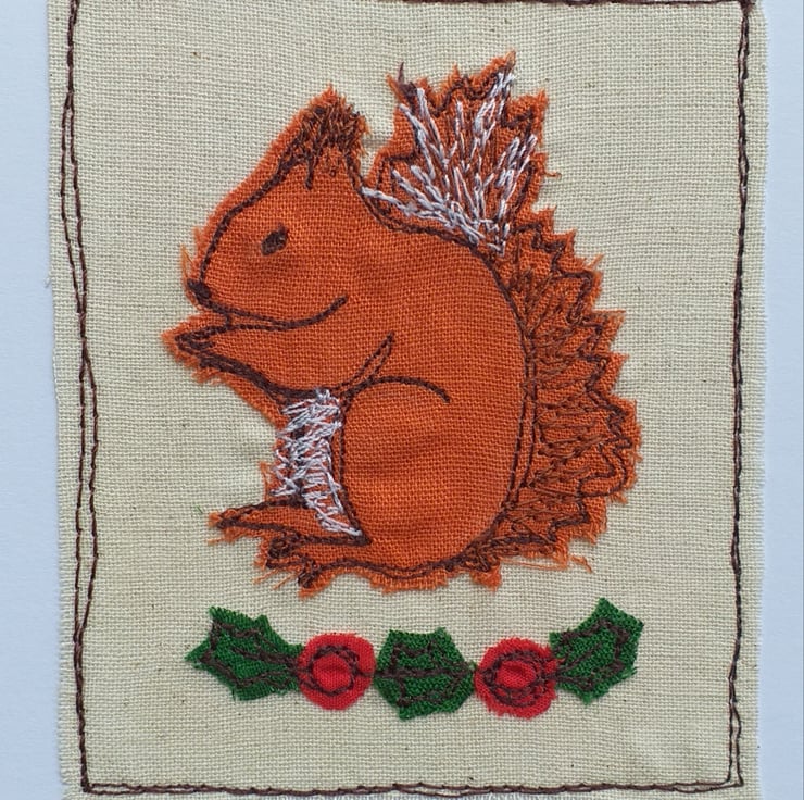 A little squirrel and holly Christmas card made from fabric appliqued and stitched using free motion embroidery.