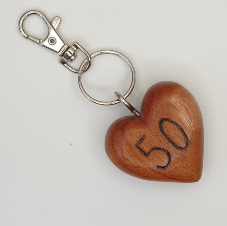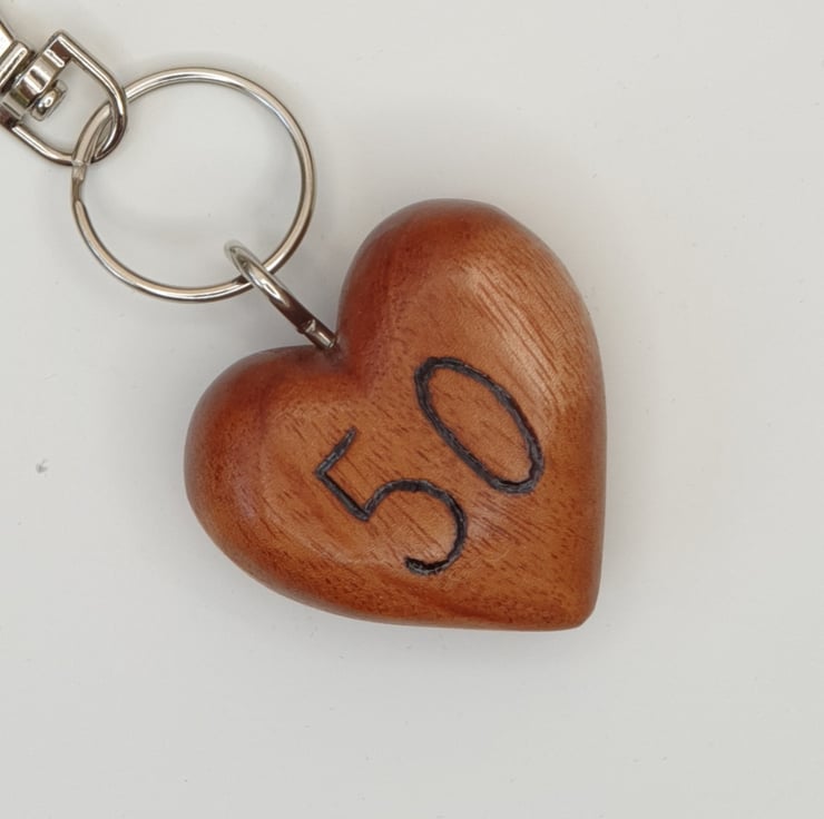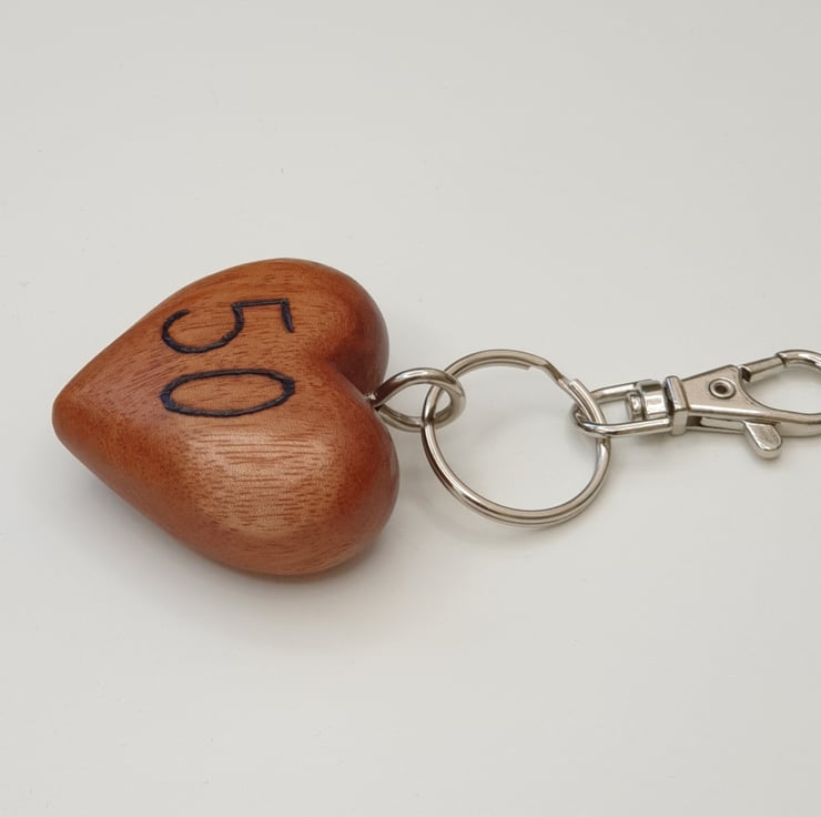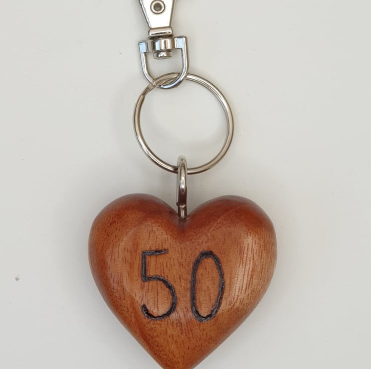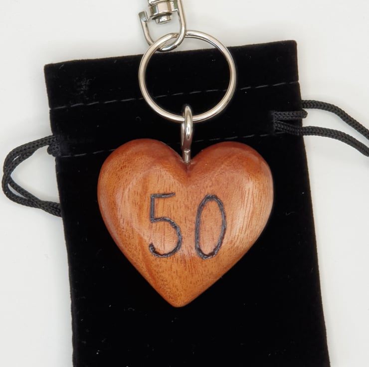 Lovely 50th birthday milestone birthday keepsake heart keyring made from solid beech. The '50' has been carefully handburnt on the front using pyrography. The heart has then been varnished for protection. This solid wood heart keyring comes attached to a lobster clasp which can be attached to a bag or belt and comes packaged in a smart black velvet drawstring bag.