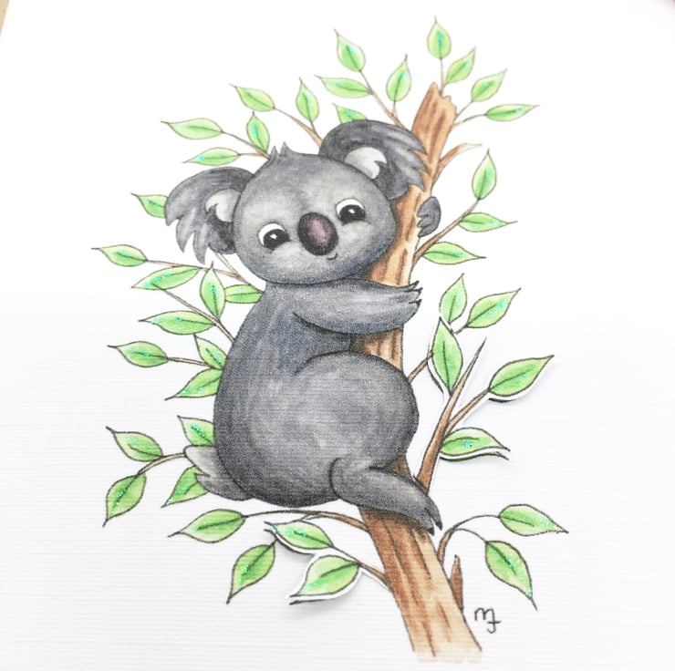 This cute Koala card has been designed using my own original illustration. The image has been printed out onto good quality white linen embossed card and decoupaged up in parts. I have also added a little glitter detail.