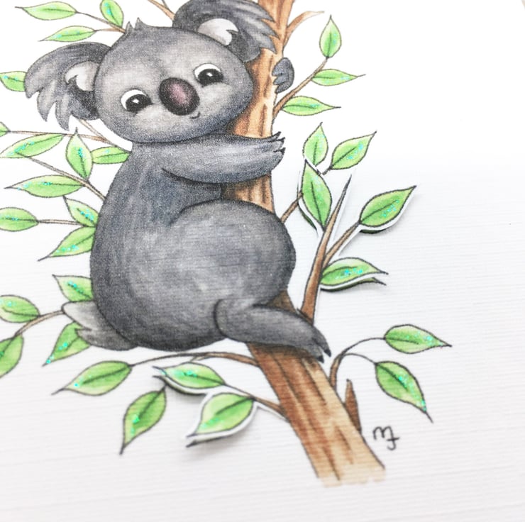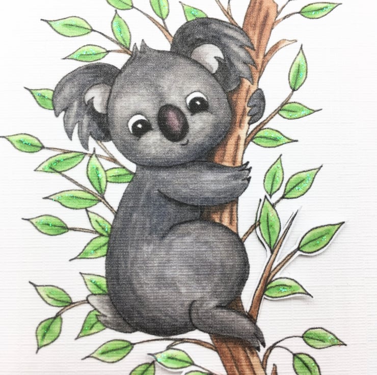 This cute Koala card has been designed using my own original illustration. The image has been printed out onto good quality white linen embossed card and decoupaged up in parts. I have also added a little glitter detail.