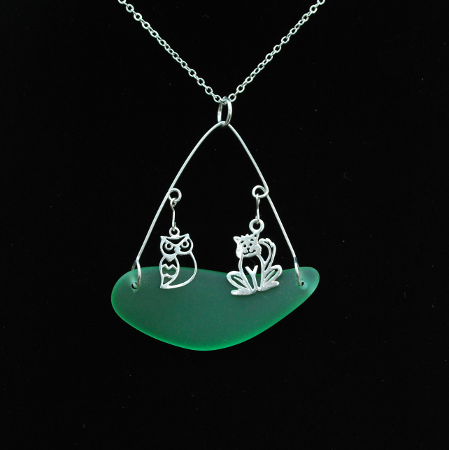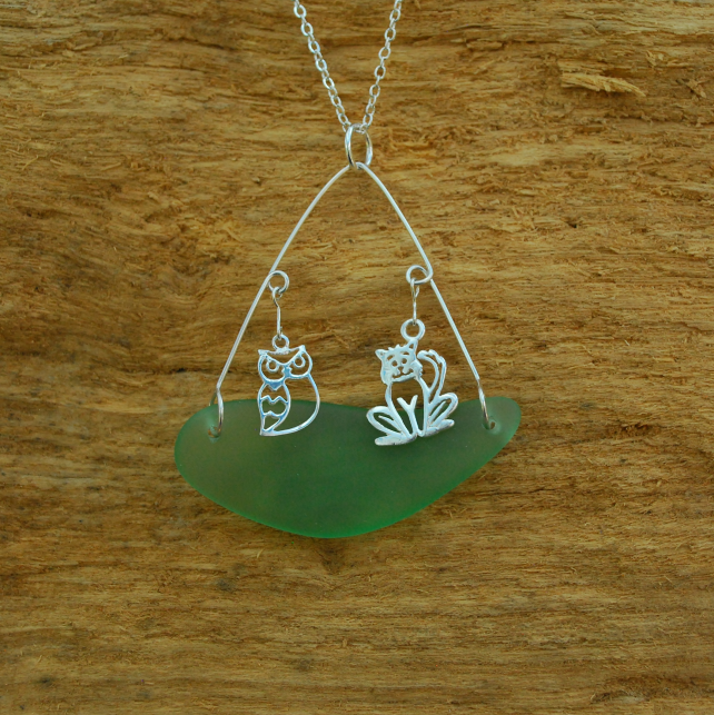 The owl and the pussy-cat went to sea in a beautiful pea-green boat made from beach glass. This characterful pendant was inspired by Edward Lear's much-loved poem. The glass has come from an old bottle and curves behind the charms. We have tumbled the glass so it is silky smooth and perfectly rounded. All the metal in this eye-catching pendant is sterling silver.