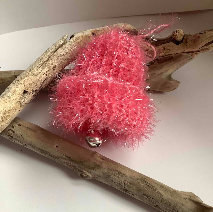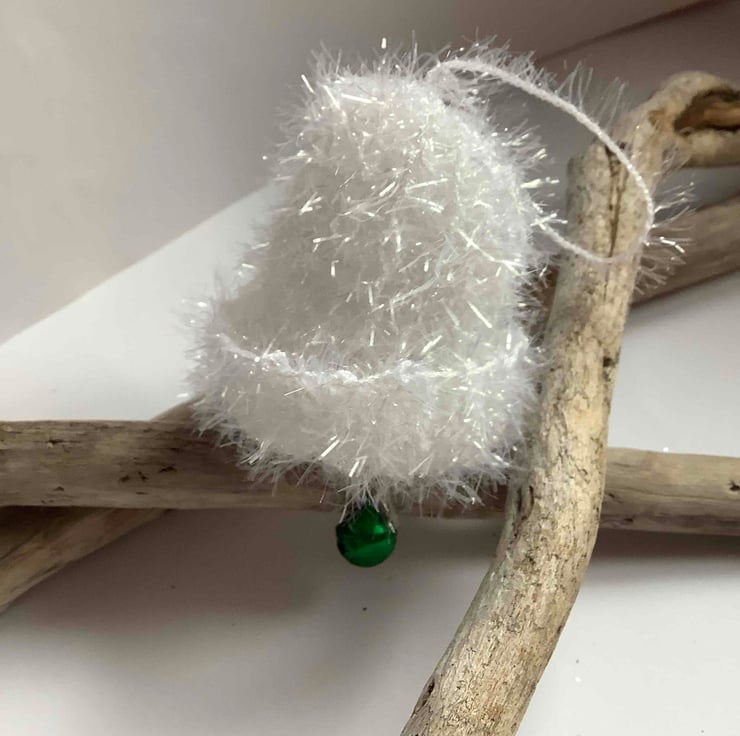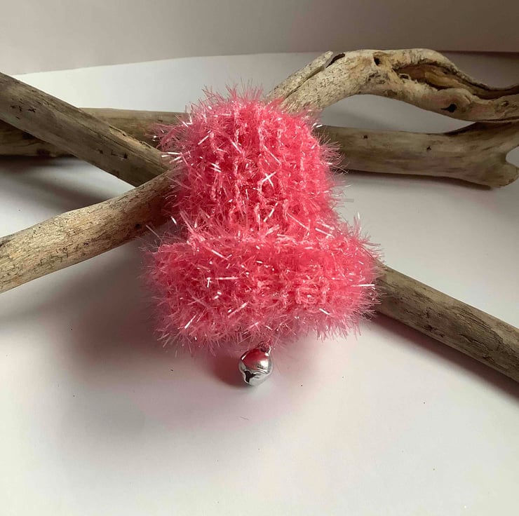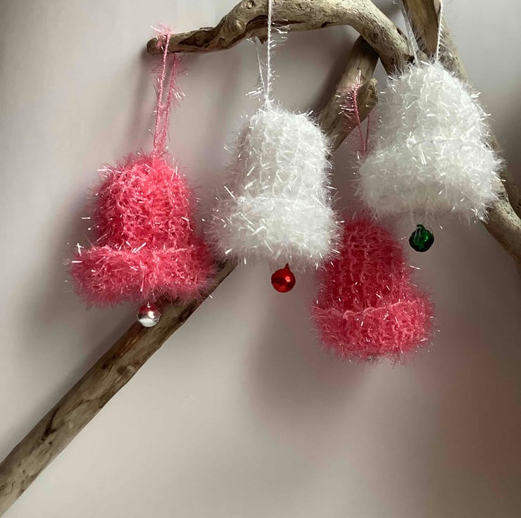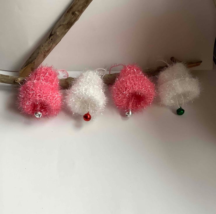 A set of 4 hand knitted bells with wool lengths as hangers and little bells inside. Colours in pink and snowy white. Pink bells have silver jingles and white bells have a green and a red jingle attached.