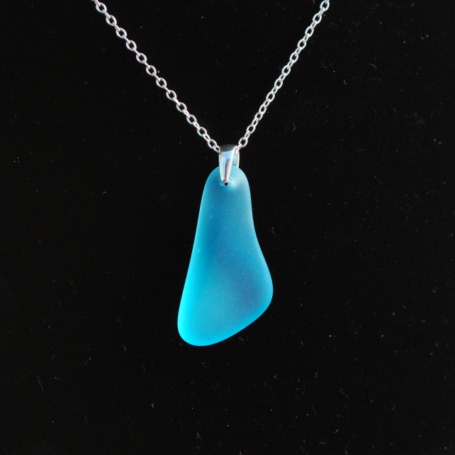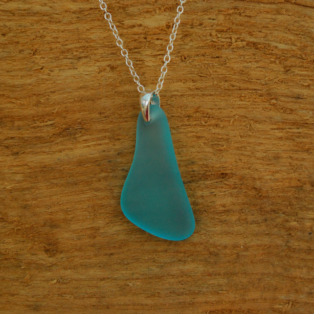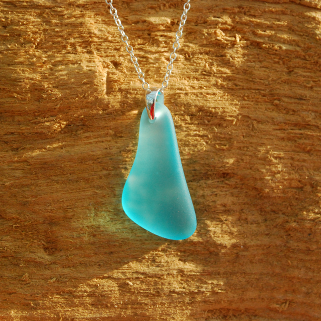 The wonderful thing about pieces of beach glass is that they've come from something which has broken, so each one has its own unique shape. This piece of tumbled glass is a very rare colour, and has probably come from a piece of domestic glassware. It's a twisted curved shape which looks great from both sides. The fine frosting catches the light beautifully, so the pendant looks fabulous against many colour backgrounds.