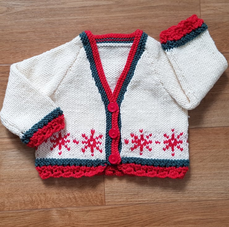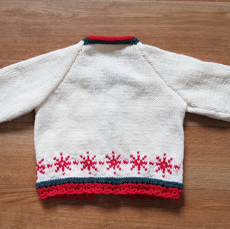 Lace edges in red and green. Cream Cardigan with snowflakes