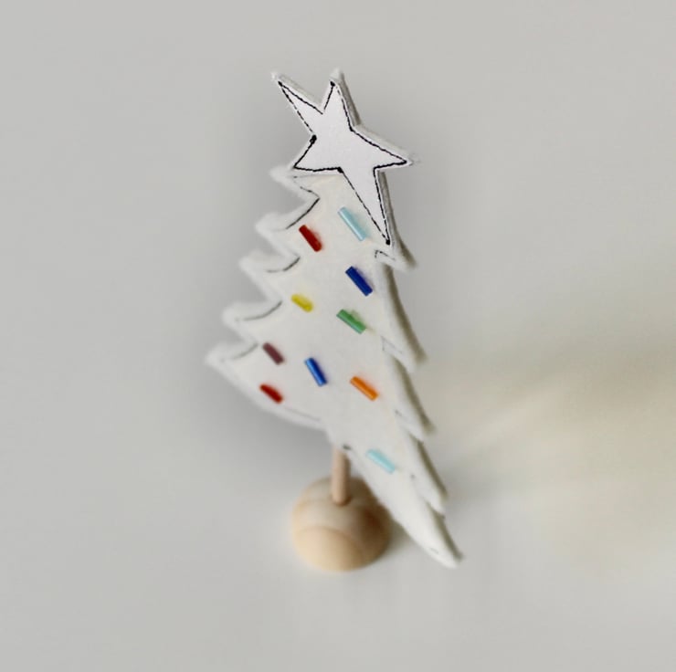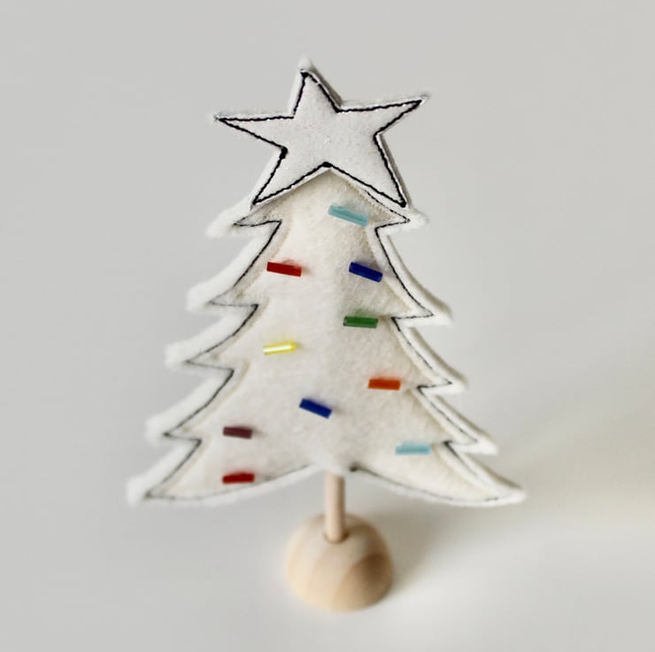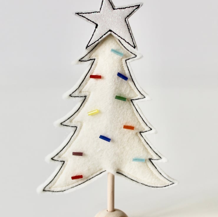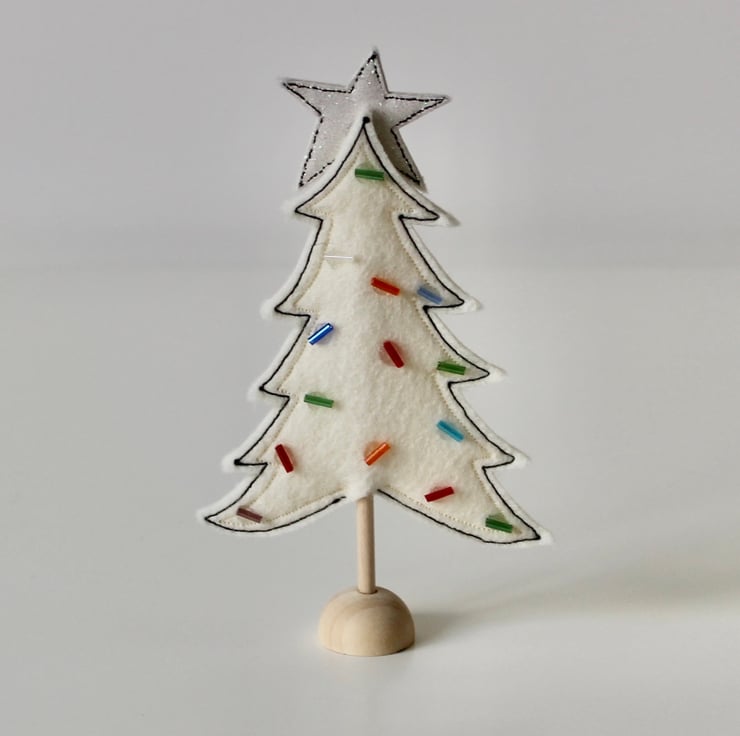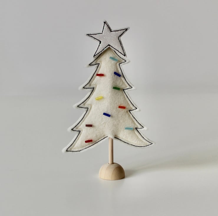 Sprinkle trees are created using free hand machine embroidery, 100% wool felt, glitter cloth with a sanded wooden trunk and stand.