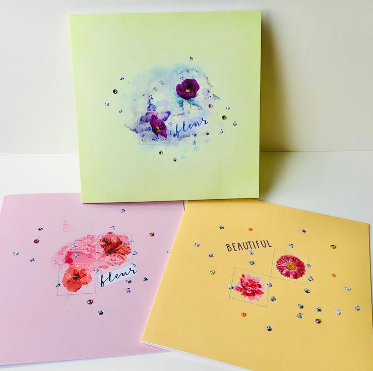 The collage design features matching or contrasting colours of different flowers, Handfinished with glitter, paint and crystals