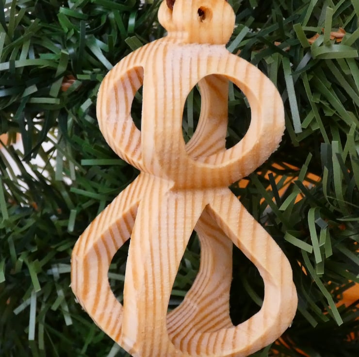 A piece of recycled wood was cleaned and sanded to enable me to upcycle it. The design was applied to the wood and cut using a Scroll Saw. The ornament was then lightly sanded all around to give it a slight round over effect. It was coated with Danish Oil which is food and toy safe.