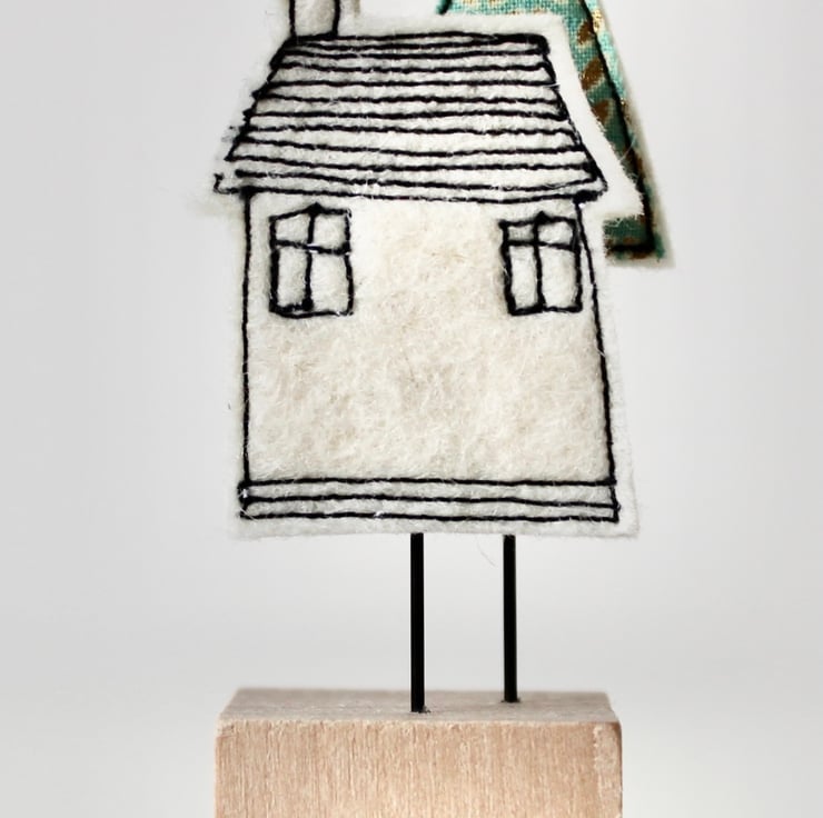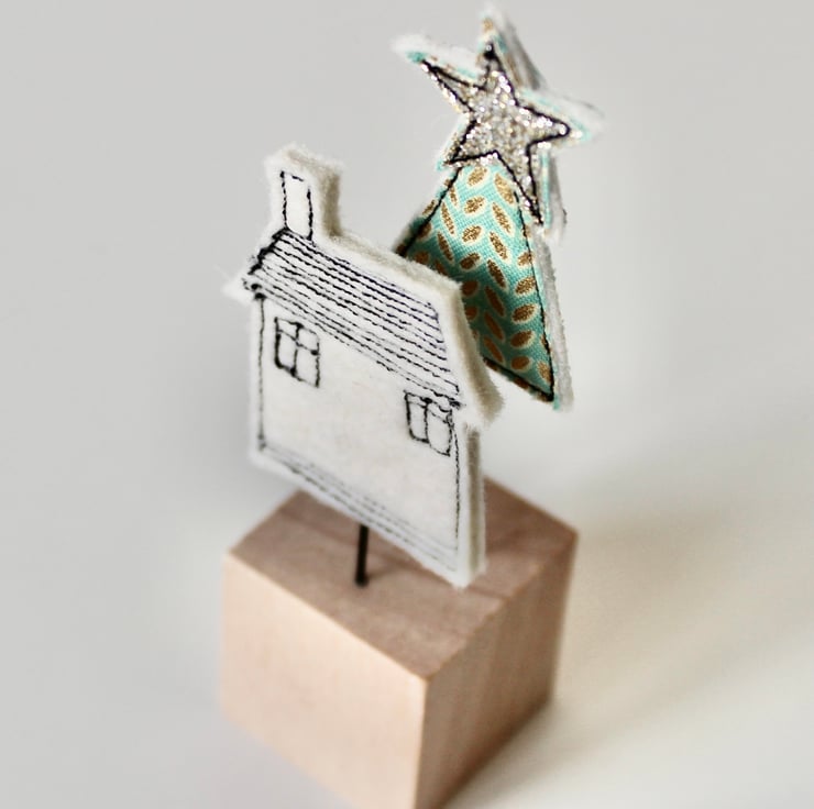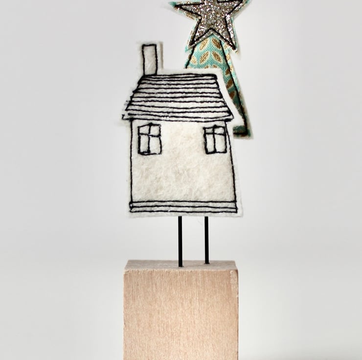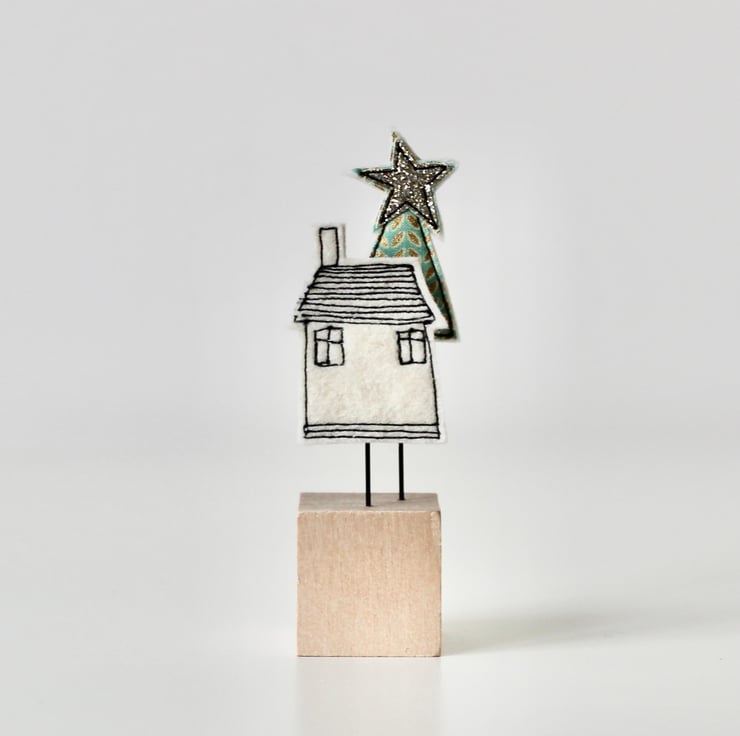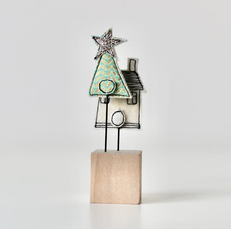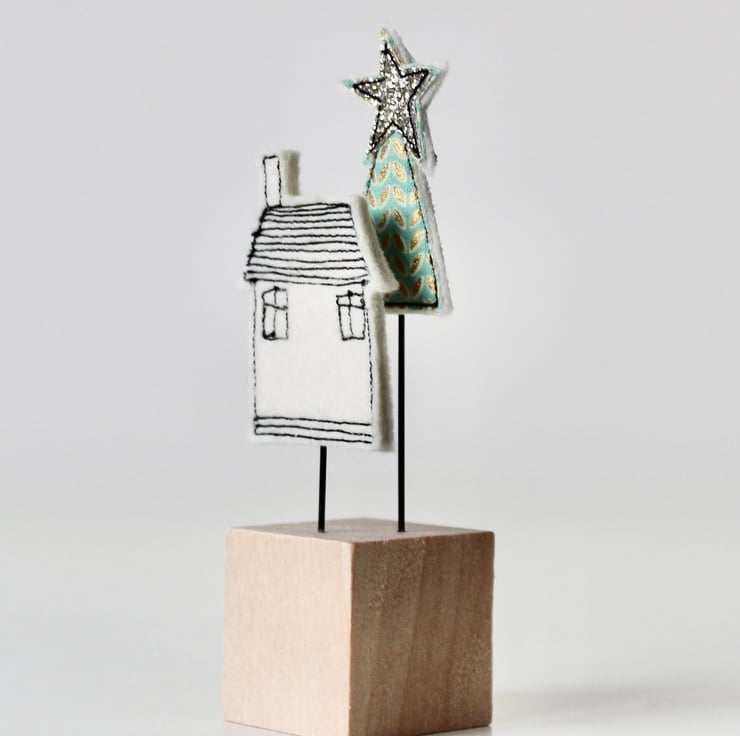 House and tree are sewn using 100% wool felt, cotton cloth, glitter cloth and free hand machine embroidery; multiple layers of cloth are sewn together and cut out by hand using sharp scissors. Mounted on a 3cm cube wooden block which can adorn a mantle piece or any flat surface.