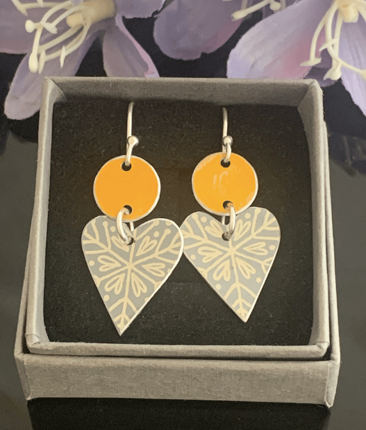 All my aluminium jewellery is inspired by one thing, my love of colour! I love to find ways of introducing colour into my work especially hand dyed methods. Each sheet of aluminium I print and dye is unique due to the process. Elements of each dyed panel are then selected and incorporated into my designs.