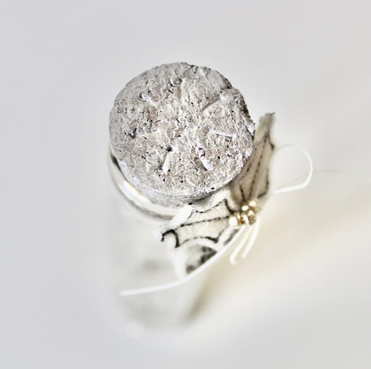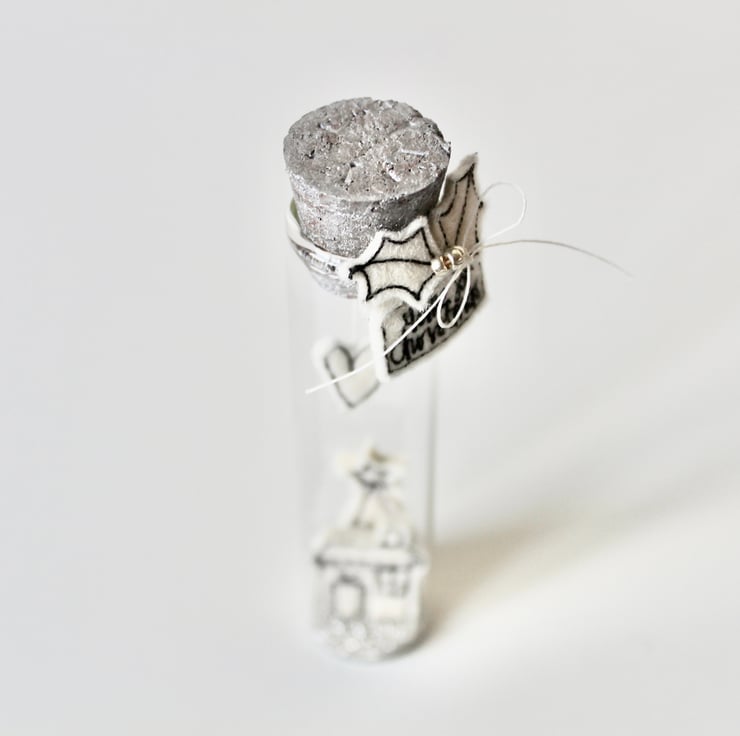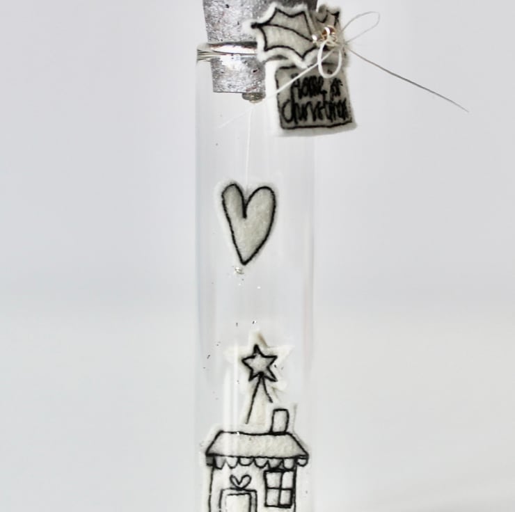 'Home for Christmas' is created using 100% cream wool felt and free hand machine embroidery. There is sewn holly and three metallic glass beads around the bottle neck and a silver hand painted cork.