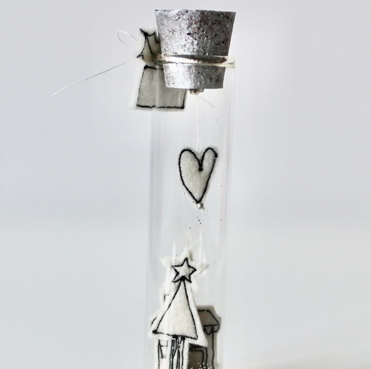 A little house and Christmas tree are surrounded by snow (not real snow, sorry, its glass glitter!), with a heart above.