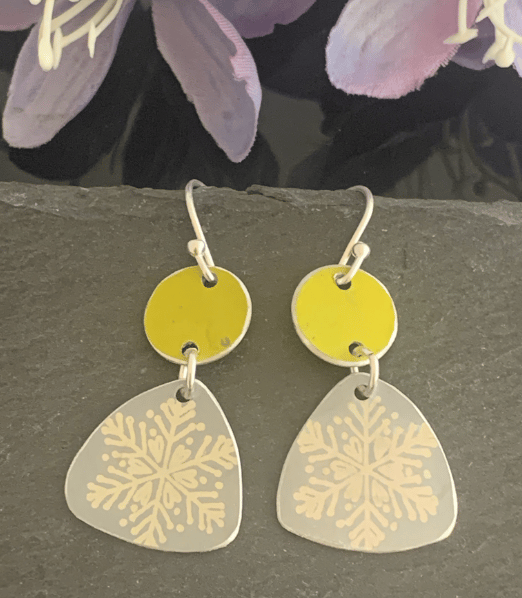 This is part of a new range featuring Scandinavian/folk art inspired prints. Panels of aluminium are hand painted and printed with a combination of colours. Each panel created is a one off due to this process and then I select areas to use in my jewellery. All pieces are hand crafted in my Cheshire workshop.