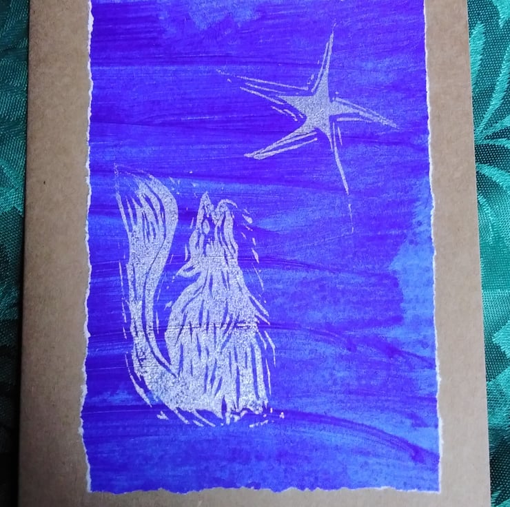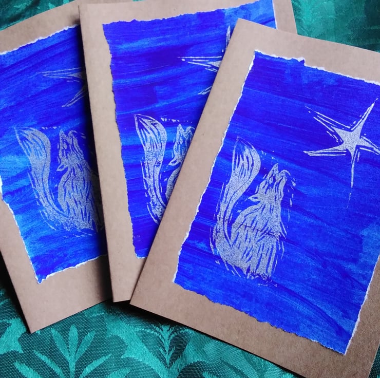 A pack of three, unique hand-printed original design greetings cards, featuring a winter wolf, head flung back in a celebratory howl gazing up at a lone star glittering in the night sky.