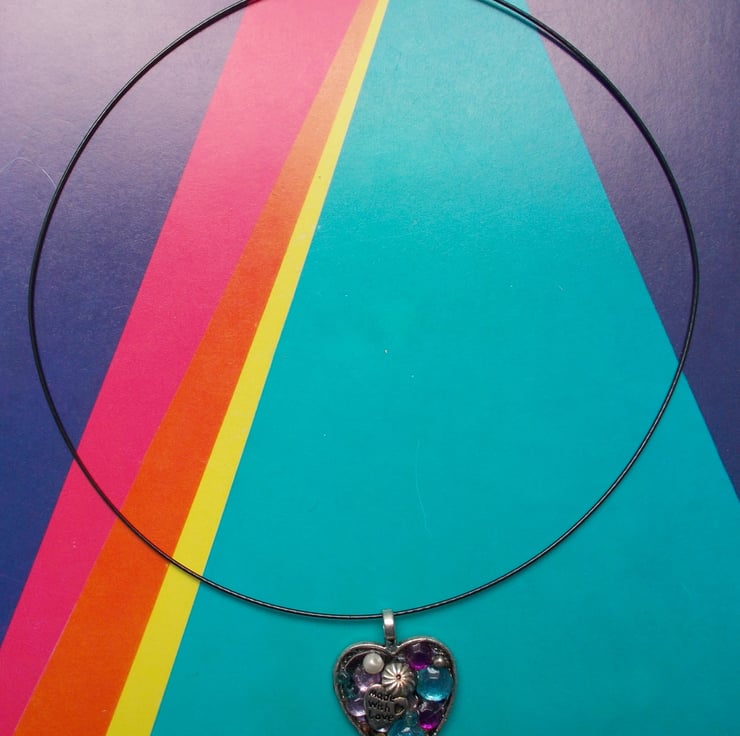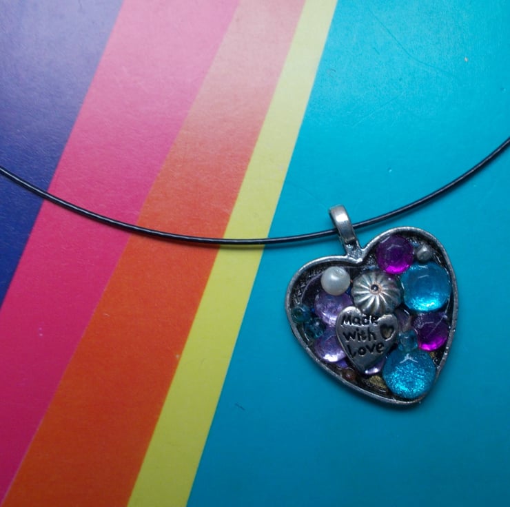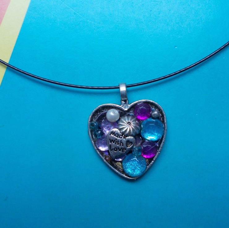 Handmade with love, this heart shaped pendant is full of blue, purple, pearl and silver gems, beads and treasures. Hanging on a black coated stainless steel wire with a twist fastener this gorgeous necklace is the perfect gift for someone you love. Free UK postage.