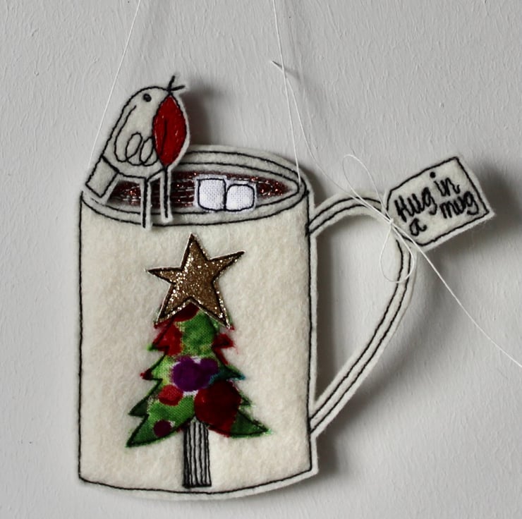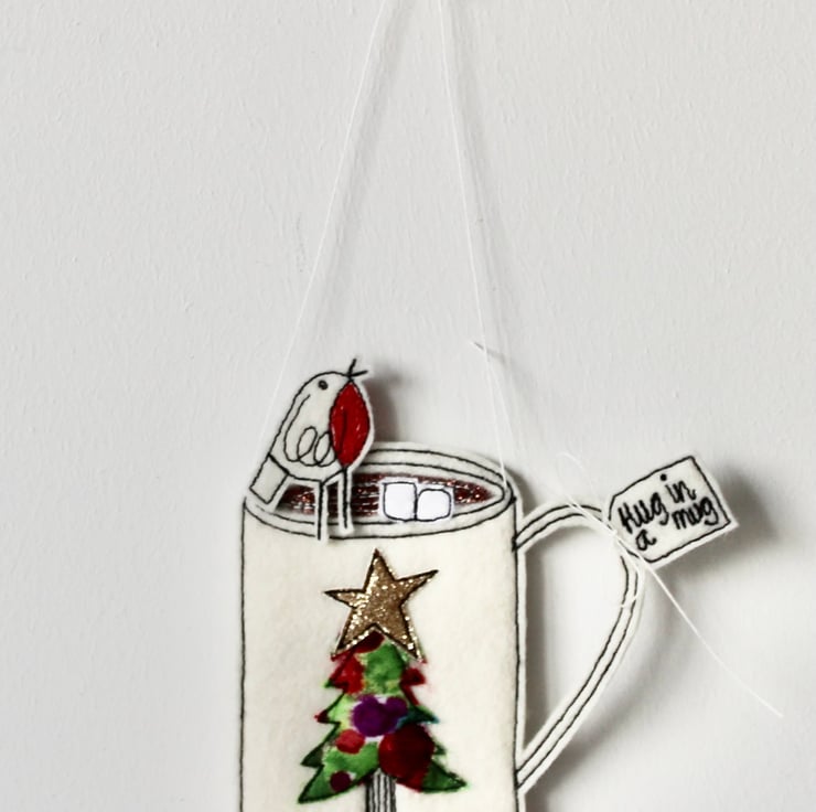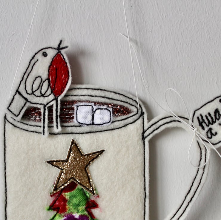 A delightful hanging decoration which is created using multiple layers of 100% wool felt, cotton cloth, glitter cloth, free hand machine embroidery and cut out by hand, using a very sharp pair of scissors.