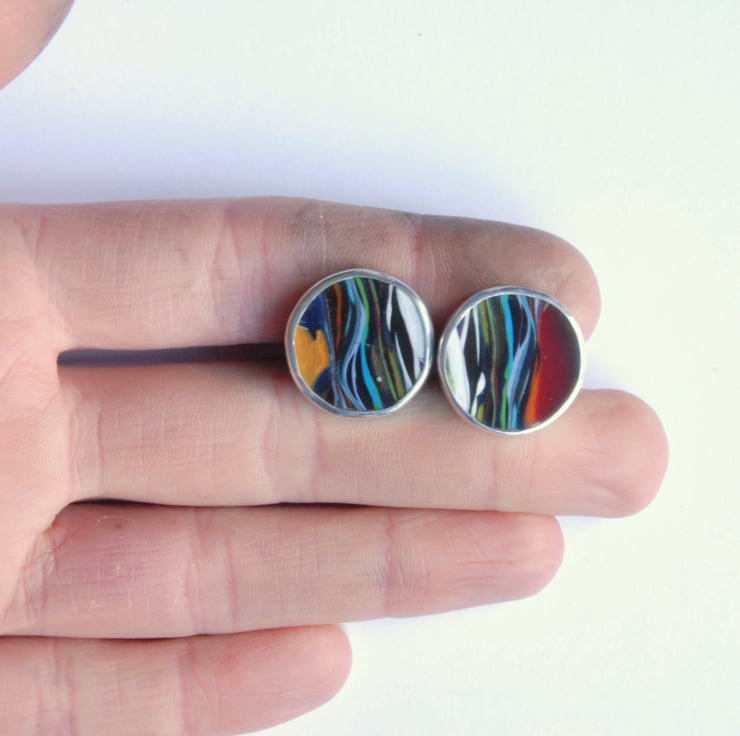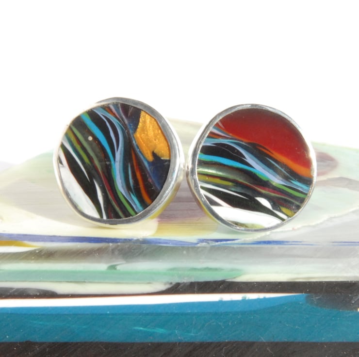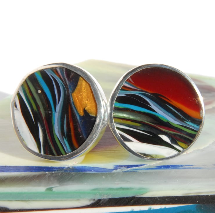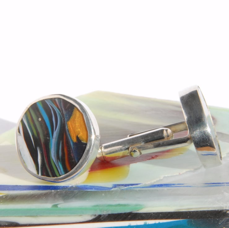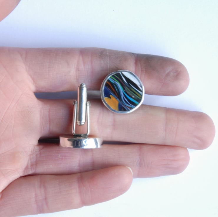 These swivel back cufflinks feature a rounds of cornish surfite which is bezel set in sterling silver, the surfite has a swirly pattern in shades of blue, white, green red and sparkly orange, some of the colours are transparent and light can reflect off the setting behind them. The sterling silver swivel backs make them easy to put on. Measure approx 19mm diameter and the tops are 4mm thick, they have a smooth flat top so they don't snag when being worn under a jacket and surfite is a light weight material.